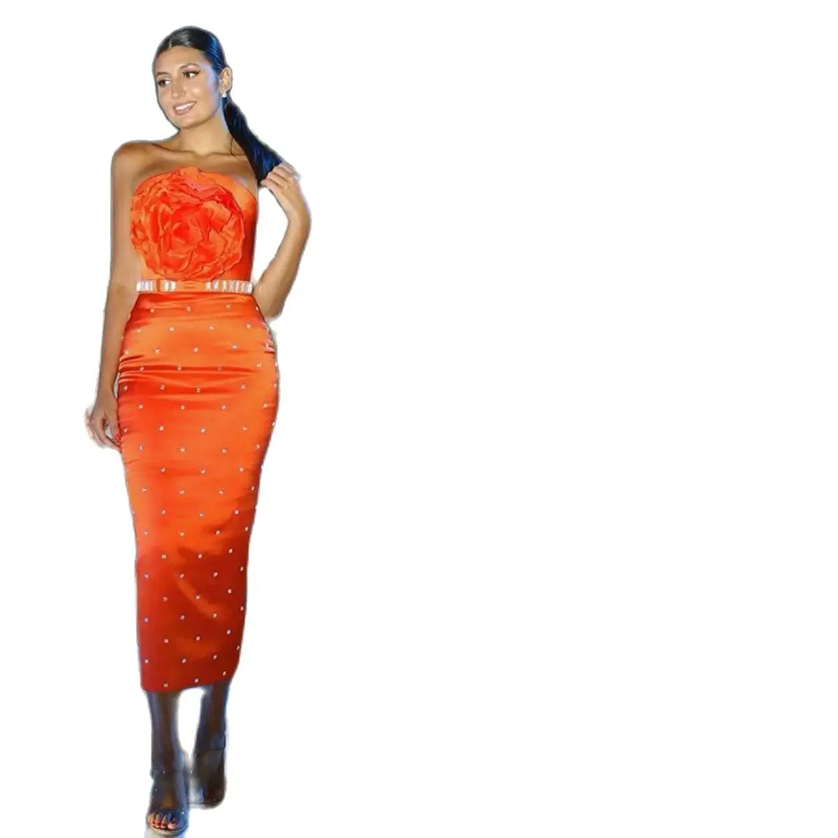2021 Простой без бретелек Оранжевый Чай Длина Выпускные платья с цветами ручной работы из бисера Коктейльные Вечерние женские платья
