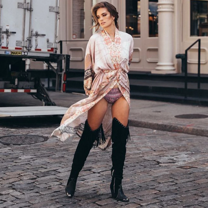 Женское длинное пляжное кимоно с богемным принтом и поясом