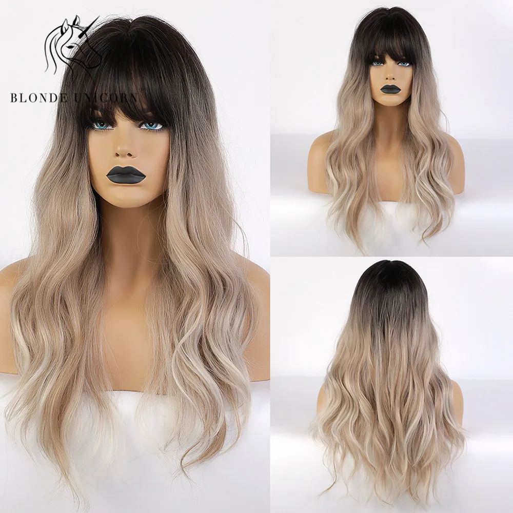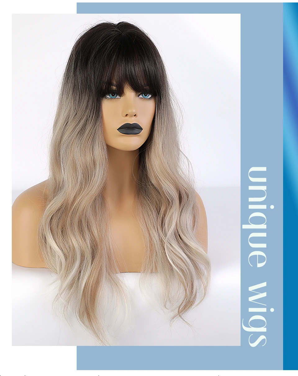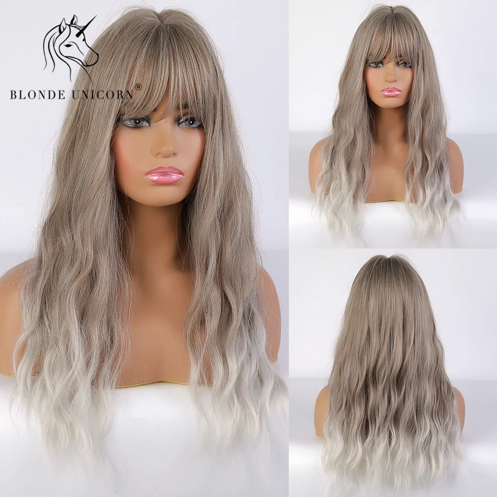 Blonde Unicorn Long Synthetic Natural Wavy Brown Ombre Light Grey Wig with Bangs Heat Resistant Fiber Hair for Women Daily Wear