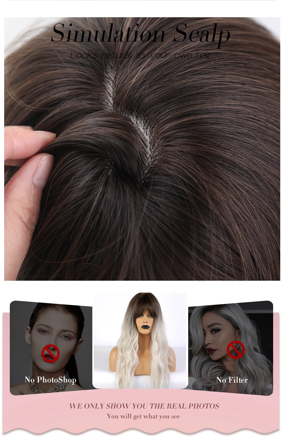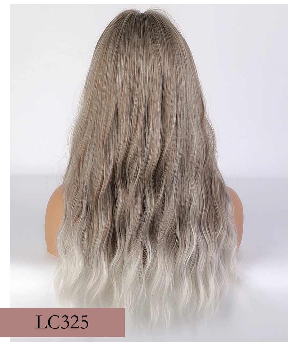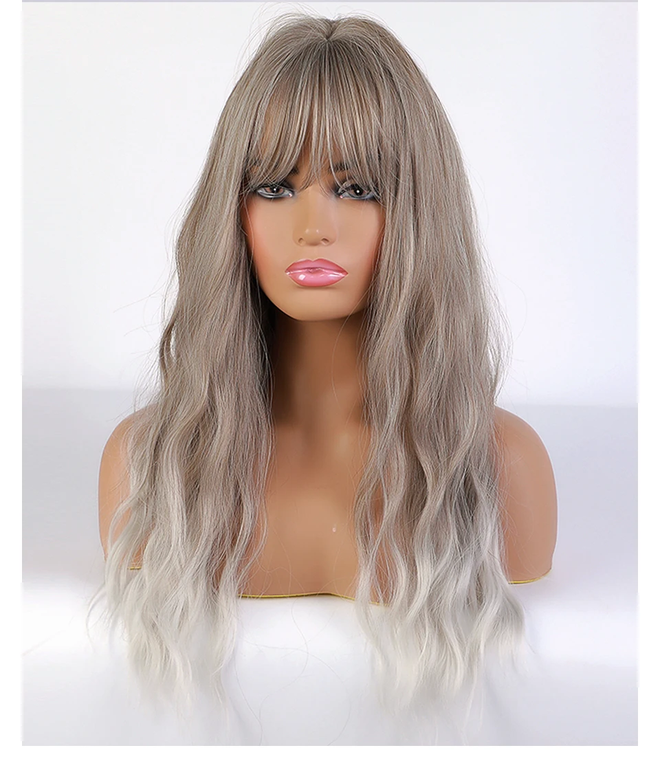 Blonde Unicorn Long Synthetic Natural Wavy Brown Ombre Light Grey Wig with Bangs Heat Resistant Fiber Hair for Women Daily Wear