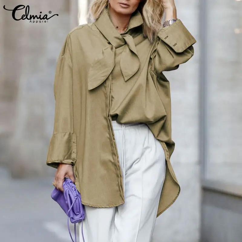 Celmia женские элегантные бандажные рубашки с бантом, весенние повседневные свободные Однотонные блузки с длинным рукавом, модные офисные топы с пуговицами и лацканами