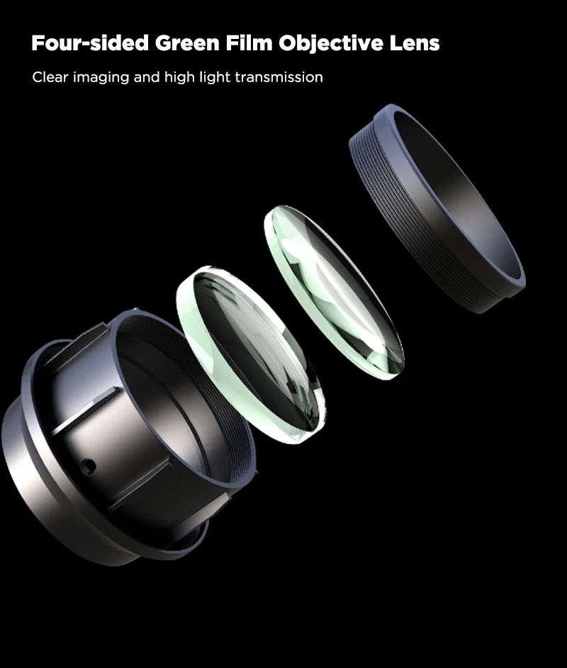 Четырехсторонний объектив с зеленой пленкой для четкого и высокопрозрачного изображения.