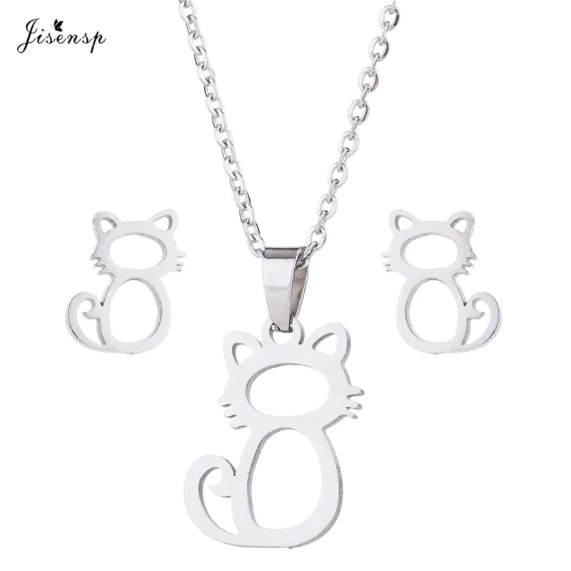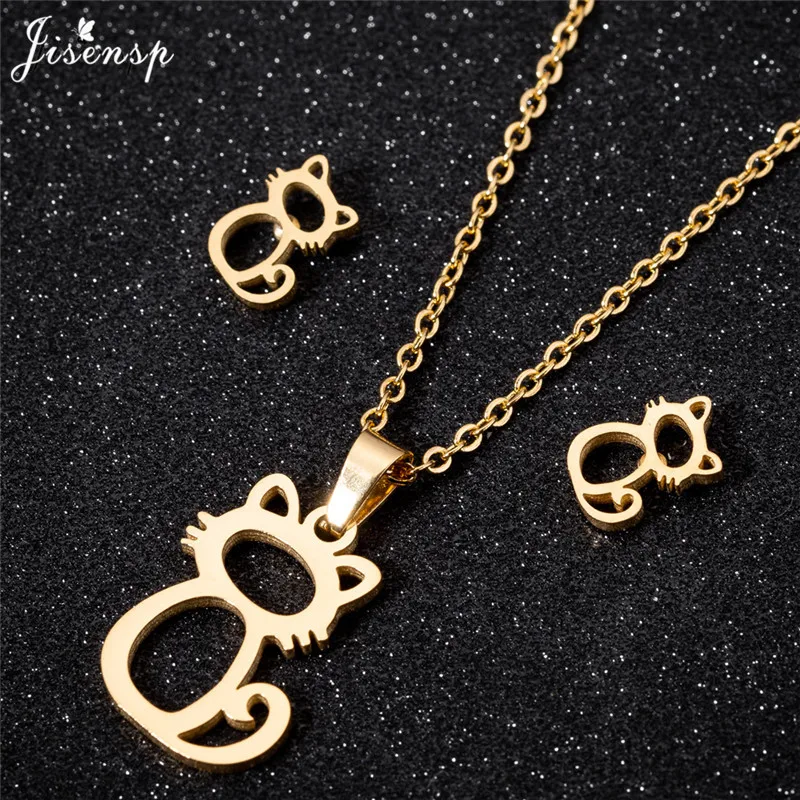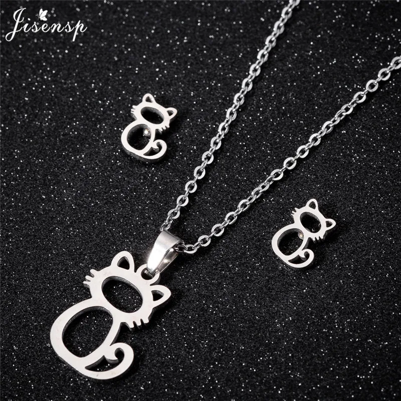 Jisensp в виде симпатичных животных из нержавеющей стали ювелирные изделия нержавеющей стали наборы полые котенок кошка ожерелье серьги для женщин ювелирные изделия на день рождения, ювелирное изделие, подарок