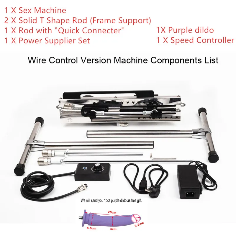 1 х Основной корпус машины2 х твердого Т-образного стержня (опора рамки)1 х стержень с "Quick Connecter"1 X набор поставщика питания1 х проводной контроллер скорости1 х фаллоимитатор2 X Черный фаллоимитатор1 фиолетовый фаллоимитаторАдаптер фаллоимитатора-1 шт.