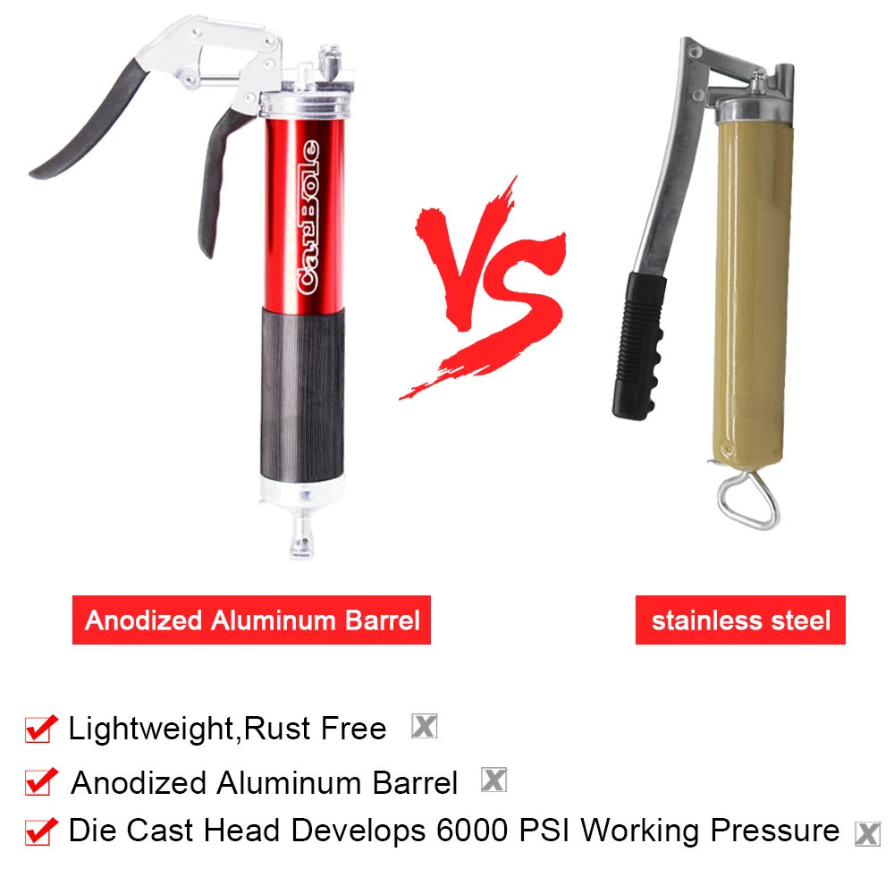 Смазочные пистолеты не всегда такие красивые, как этот. Не позволяйте красивой внешности обмануть вас-это все дело под этой сексуальной красной кожей. Он может откачивать товары при температуре до 4500 фунтов на кв. дюйм, что делает возможным впрыскивание чистой смазки в очень ограниченное пространство. Алюминиевый корпус экономит вес по сравнению с традиционными стальными моделями, а привод рукоятки пистолета создает множество рычагов для комфорта в течение всего дня. Резиновая втулка на корпусе обеспечивает дополнительное сцепление в скользких ситуациях. Загрузите его с картриджем или насыпью-выбор за вами. В комплекте со смазочным пистолетом 940798 входит металлическая прямая труба, гибкий шланг 12 дюймов и фитинг для смазки. Очень гладкий!Особенности:1. Изготовлен из высококачественного материала, прочный и долговечный2. Длительный срок службы3. Высокая эффективность и стабильная производительность4. Текстурированная резиновая нескользящая ручка, удобная для захвата5. Качественная работа и высокое качество6. Легко работатьИспользуется стандартный картридж 14 унцийСверхпрочная алюминиевая анодированная канистраВключает 12 "гибкий шланг и 5-1/2" металлический удлинитель с соединителемРучка с резиновым покрытием обеспечивает лучший захват и рычагРукоятка крышки пистолета обеспечивает вертикальную работу и превосходный комфортХарактеристики:Бренд: карболМодель: GRG001Посылка: 47 смПосылка: 14,5 смПосылка: 7,5 смВес: 1,18 кг 1. Гибкий шланг: гибкий шланг 12 дюймов и металлический удлинитель 5-1/2 дюймов с соединителем2. Торцевая чашка: съемная Торцевая крышка с положительным замком3. Двухсторонняя Загрузка: Стандартный картридж объемом 14 унций4. Усиленный шланг: тройной усиленный шланг 12 дюймов с пружиной катушки, предотвращающей закручивание5. Материал: сверхпрочная 4-кулачковая муфта с защитной крышкой из ПВХ и корпусом из анодированного алюминия6. Особенности: Текстурированная резиновая нескользящая ручка7. Рабочее давление: 4500 фунт/кв. Дюйм8. Цвет: красный и синий