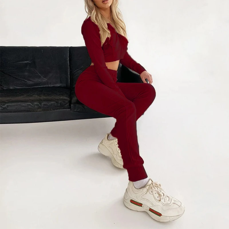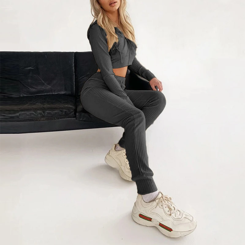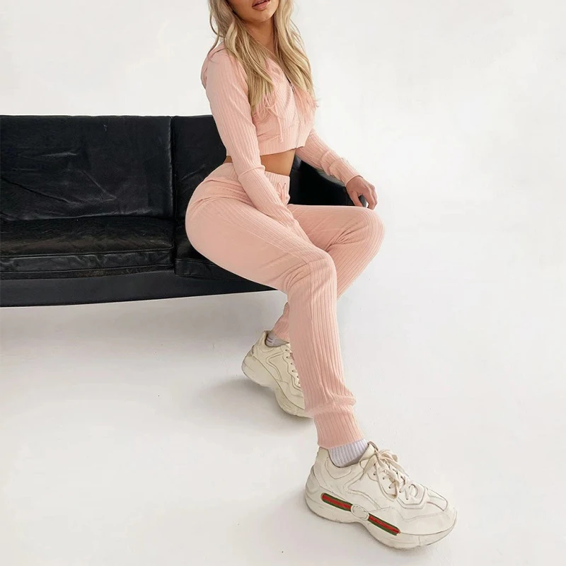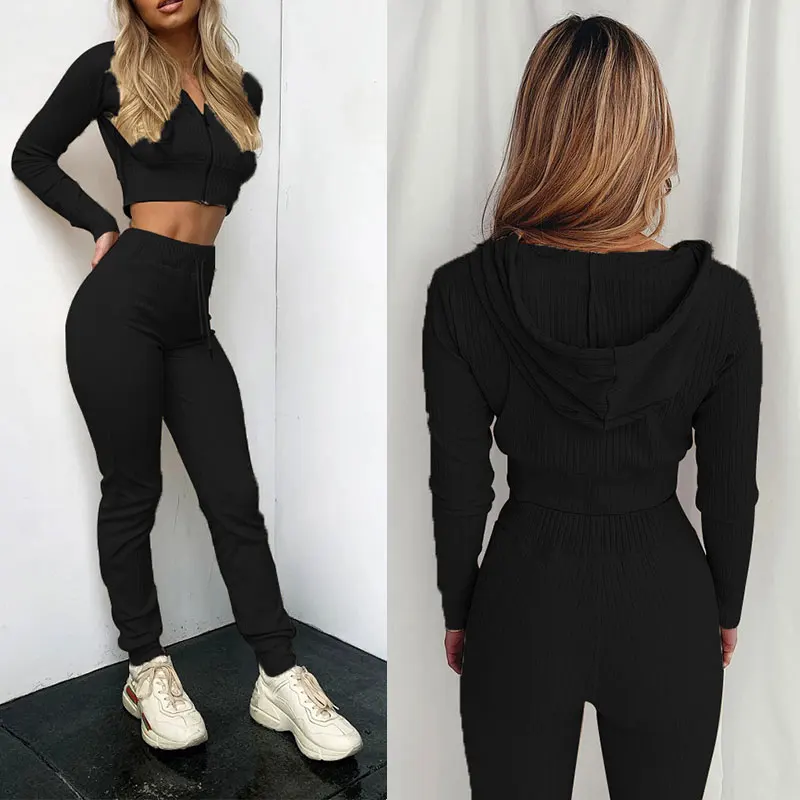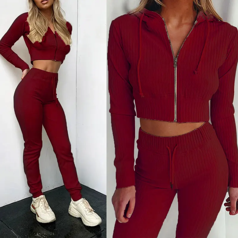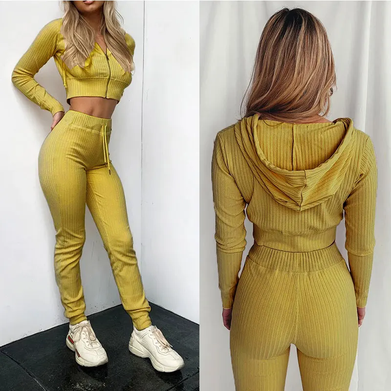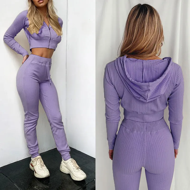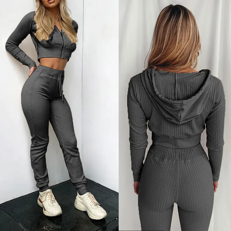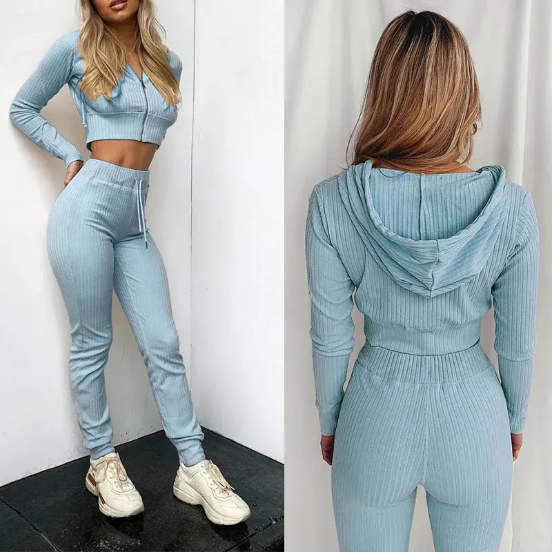 Женский трикотажный комплект из двух предметов, спортивный костюм в рубчик для отдыха, толстовки с капюшоном, укороченный топ на молнии спереди с длинным рукавом и штаны, костюм