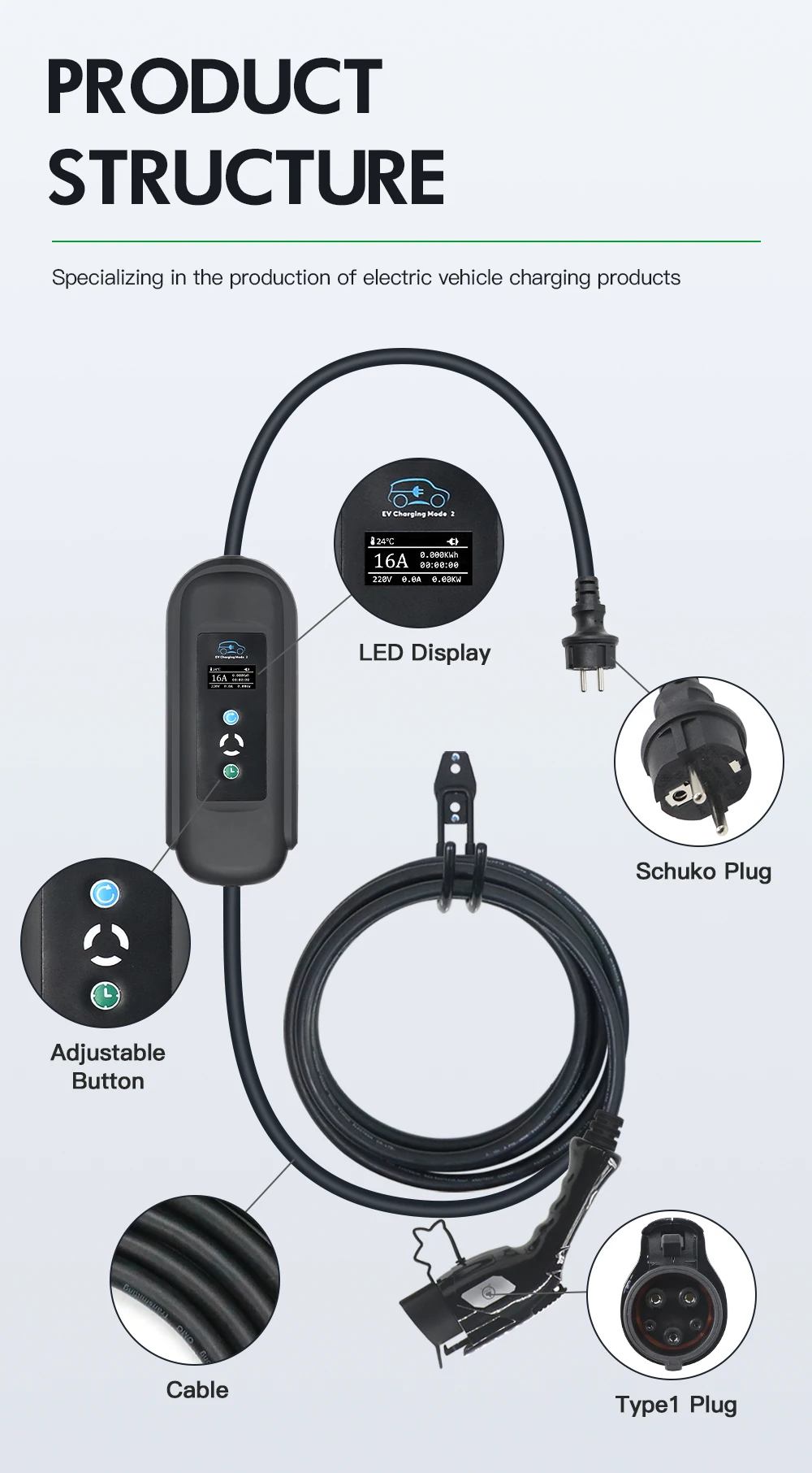 * Зарядное устройство является обычным зарядным устройством уровня 2, только для зарядки EV, оно может использоваться во всех автомобилях EV.* Портативность: зарядное устройство небольшого размера легко переносить в любое место, вы можете взять его на пикник или путешествие. Только нужно гнездо Schuko, вы можете заряжать в любое время.* Штепсельные вилки совместимы с major EV с разъемом J1772. Штепсельная вилка Schuko adapting может использоваться для быстрой зарядки вашего автомобиля на выходе 16 ампер.* EVSE обеспечивает молниепроницаемость, loeakage, перенапряжение, перегрев, -- класс водонепроницаемости IP54, UL94V-0 Огнестойкость и защиту от перегрузки по току для вашей безопасности. Также он оснащен блоком управления с-светодиодный индикатор состояния заряда поможет вам определить рабочее состояние зарядного устройства EV.