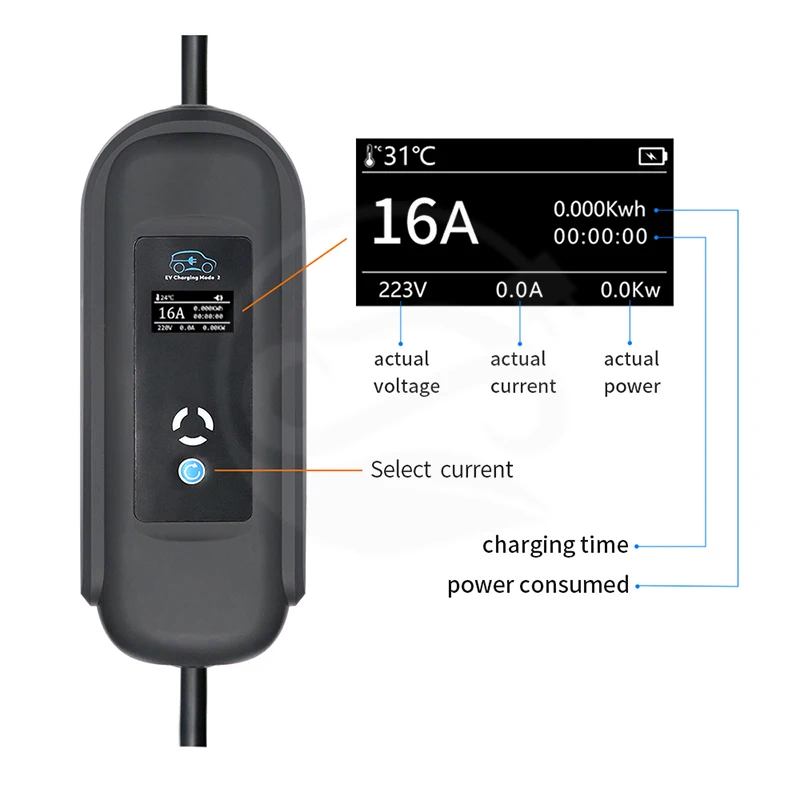 Синяя кнопка: Регулировка тока. Нажмите синюю кнопку, чтобы изменить ток. Когда вы регулируете ток, штепсельная Вилка питания всегда подключена, разъем типа 1 SAE J1772 (или тип 2) отключен. Когда вы достигнете нужного тока, подключите его и начните зарядку.