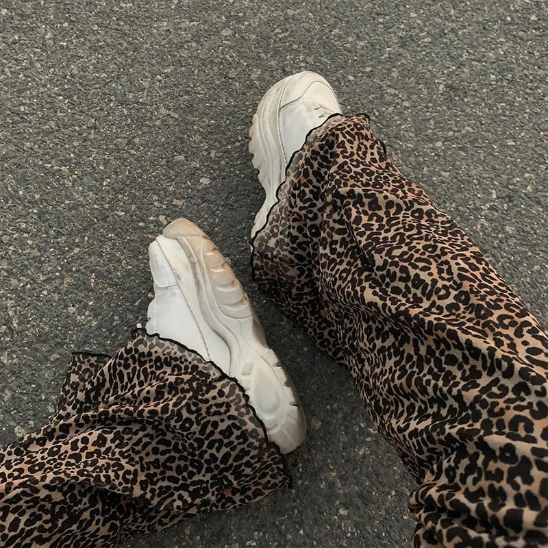 Брюки-клеш с высокой талией Y2K, модные женские спортивные штаны с леопардовым принтом, двухслойные сетчатые брюки для девочек, уличная одежда 2021