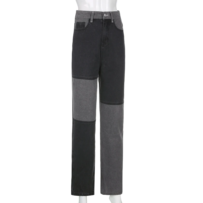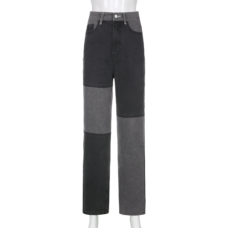 Женские джинсы в стиле пэчворк, свободные прямые пикантные брюки из джинсовой ткани серого цвета с высокой талией, карманами и цветными вставками, 2021