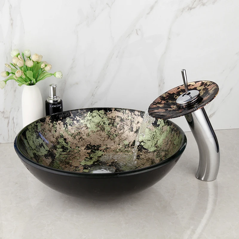 Круглая раковина из закаленного стекла KEMAIDI Crackle, с водопадом...