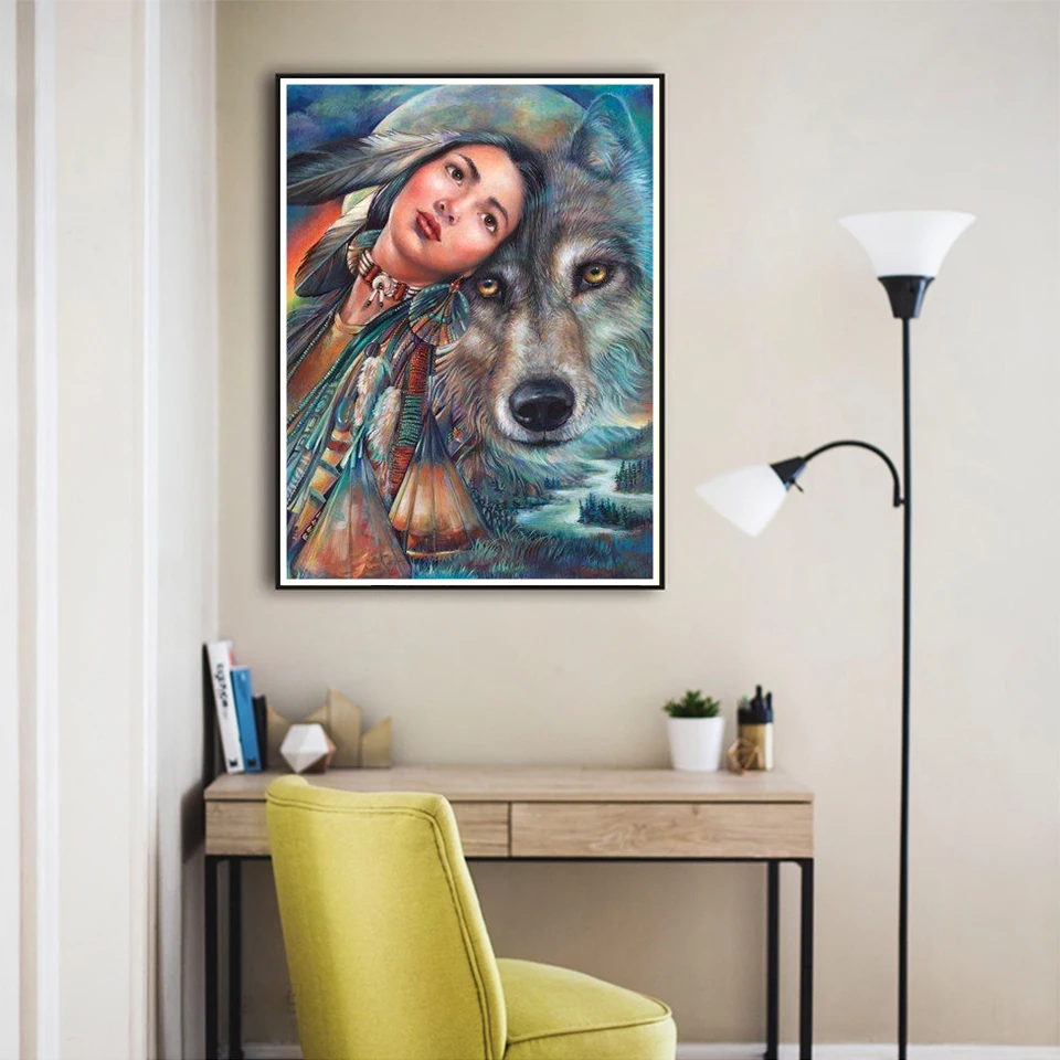Алмазная 3D картина сделай сам, красивая девушка и волк рядом с Лун...