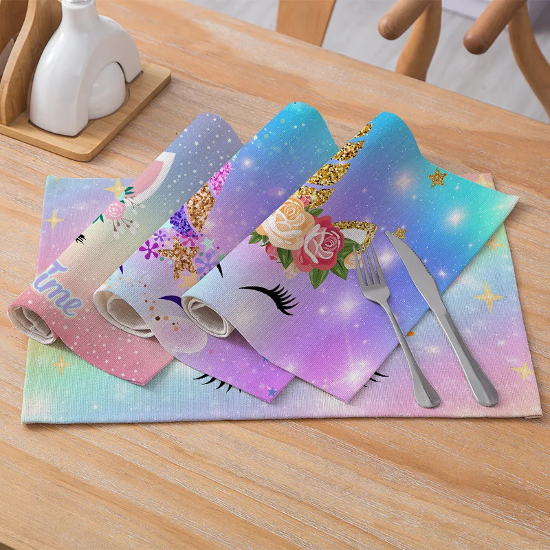 Салфетки с изображением единорога из мультфильма, с радужным принтом, водонепроницаемые коврики для стола, салфетки, простой дизайн, посуда, кухонные обеденные коврики 32*42 см/шт.