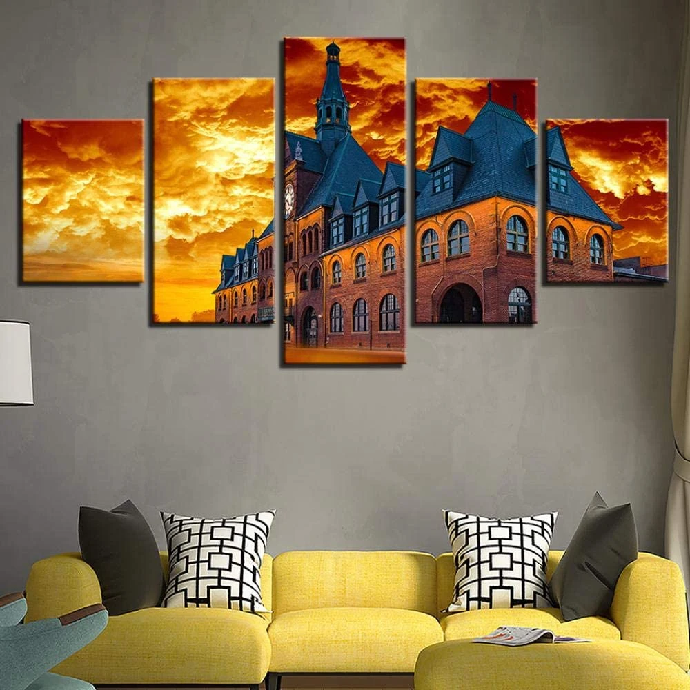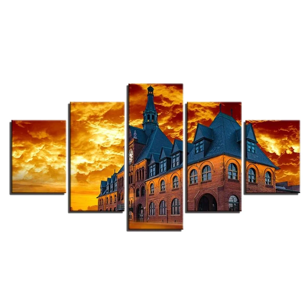 Модульные картины на холсте, 5 шт., закат, городской пейзаж, домашн...