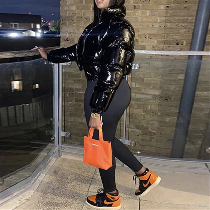 Мода пузырь пальто свободного покроя, с воротником-стойкой укороченные Club пуховик из PU искусственного материала (PU), зимняя обувь на застежке-молнии, на толстом куртки-пуховики 2021