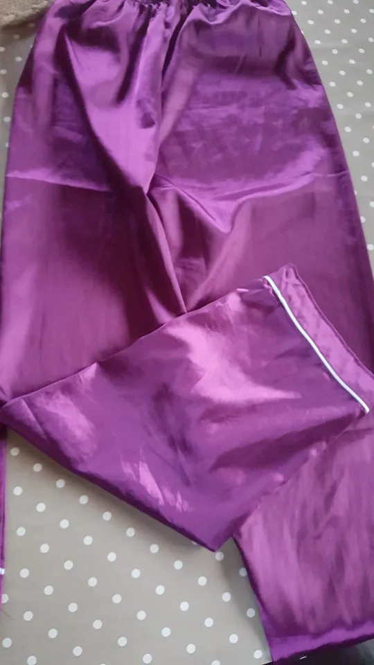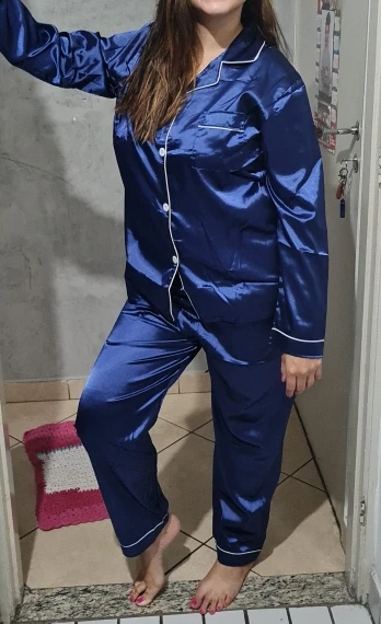 пижама синтетическая, очень электризуется. не нравится покрой штанов : они без бокового шва и между переходом и задом нет разницы- одинаковые. мои параметры об 100, ог 92. брала размер L. Не обтягивает, верх отлично, но штаны хотелось бы больше.