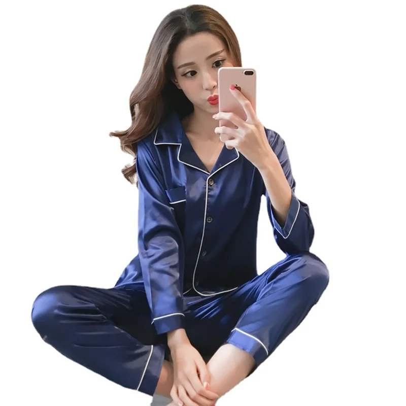 Шелковые атласные пижамы для женщин, пижамный комплект с длинным рукавом, одежда для сна, Женский Пижамный костюм, женский комплект из двух предметов, домашняя одежда