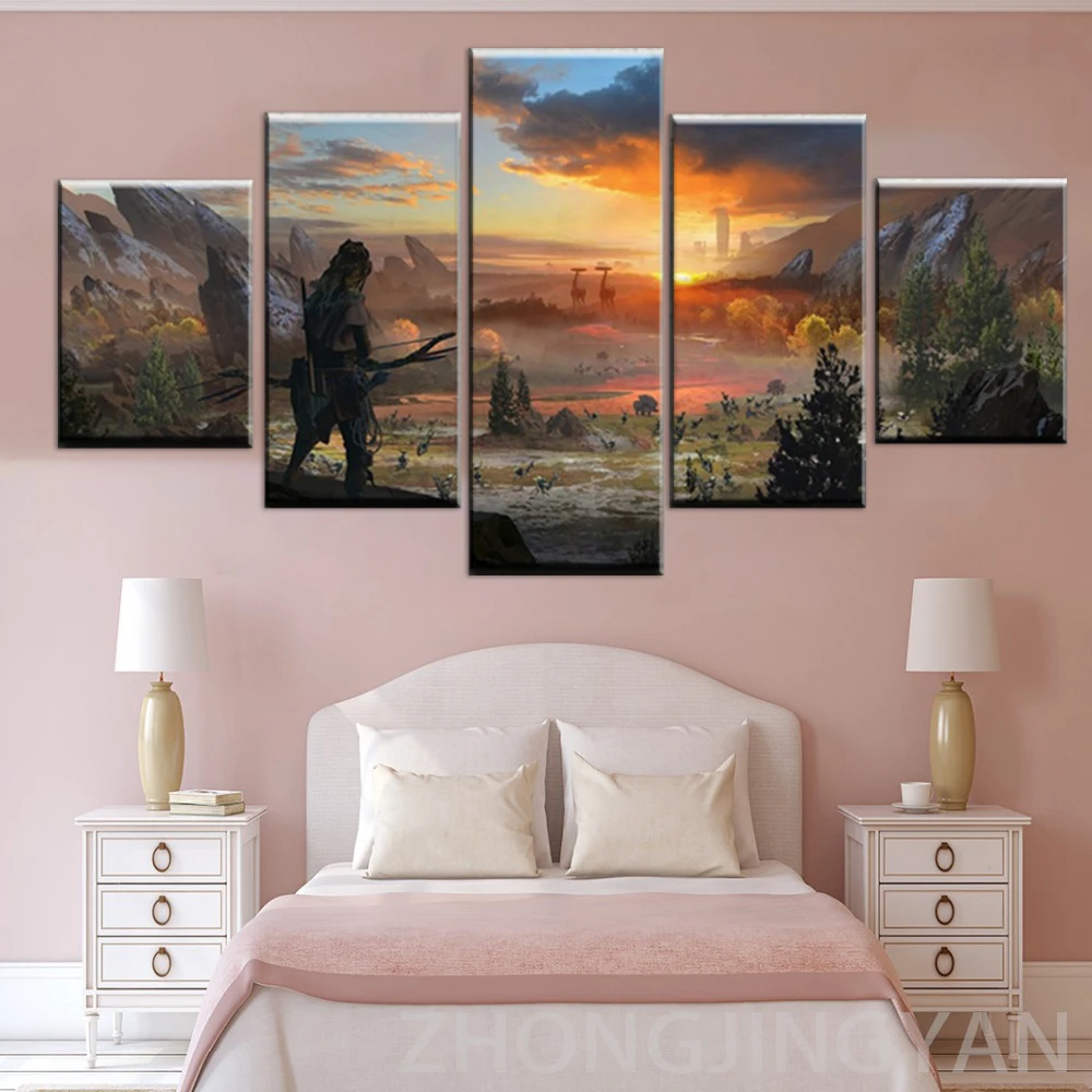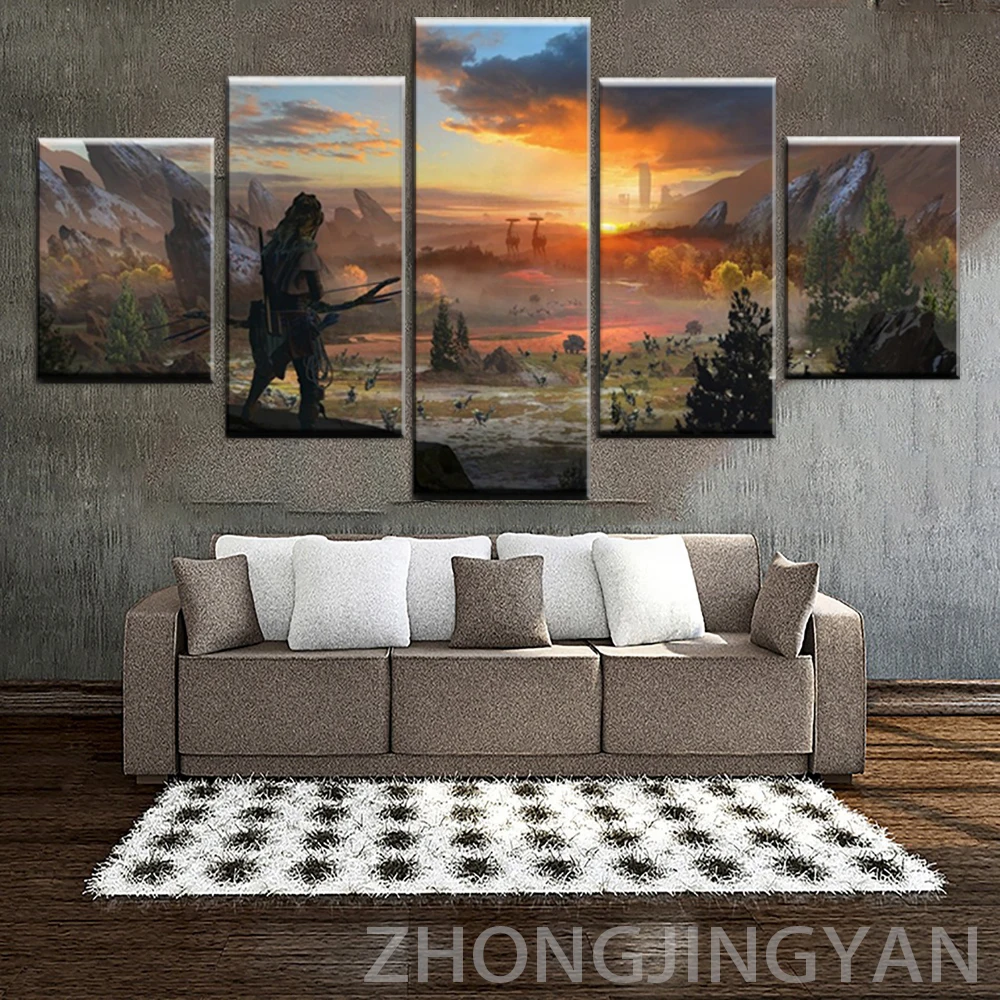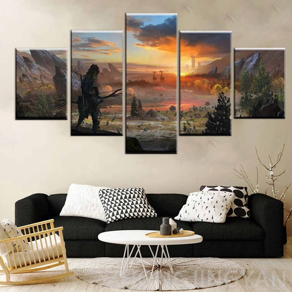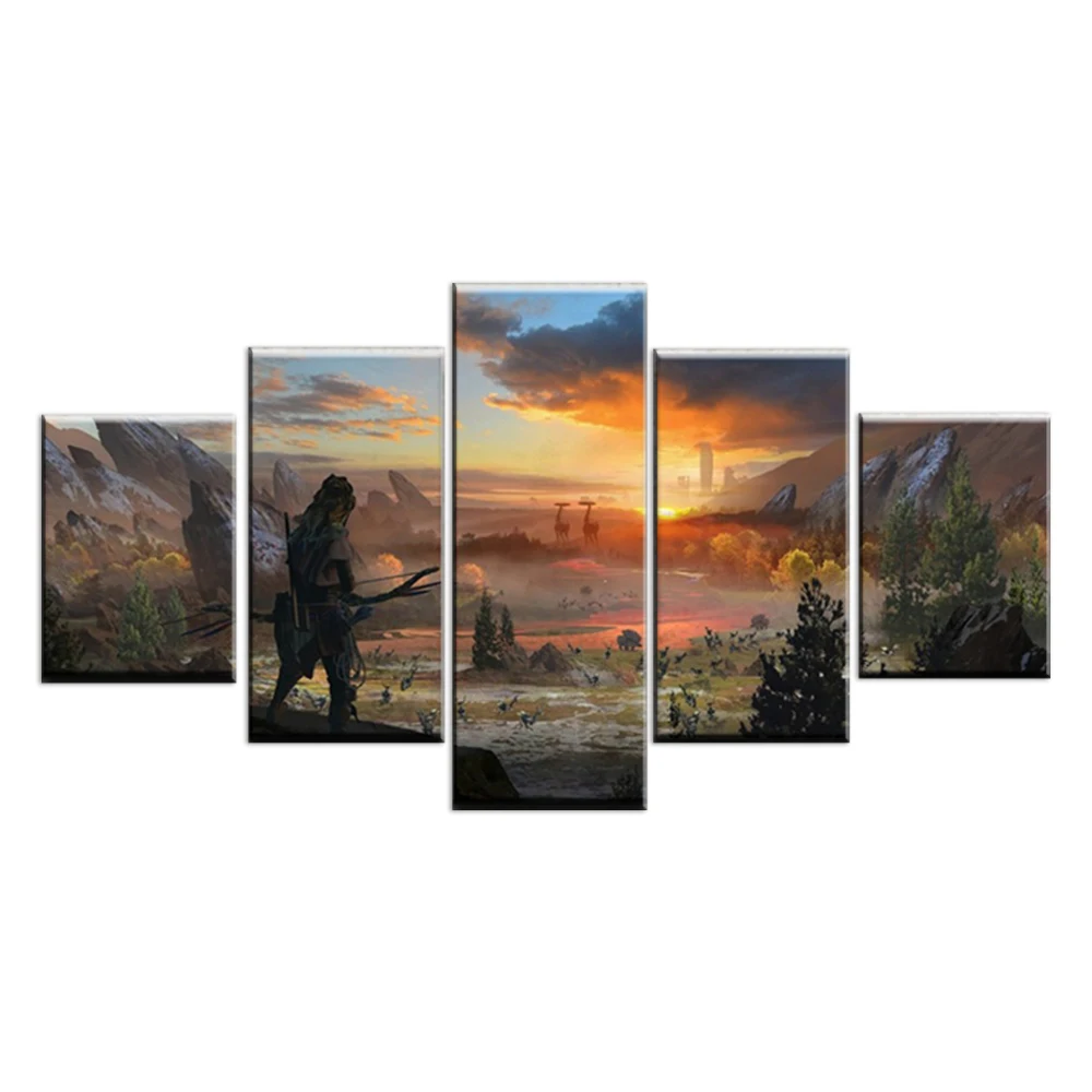 Картина на холсте Hd, настенное художественное оформление, 5 шт., картина Horizon Zero Dawn, игровое украшение для дома, модульный плакат, в рамке для гостиной