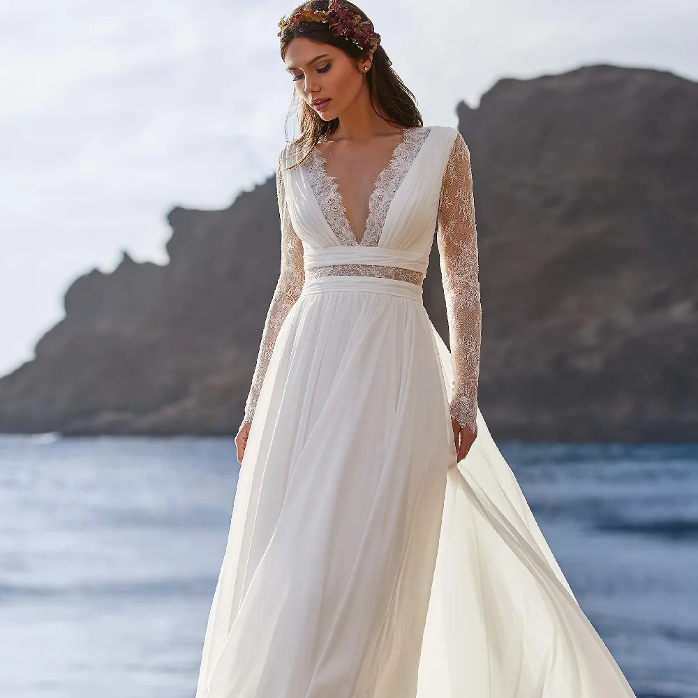 Шифоновые кружевные свадебные платья в стиле бохо с длинным рукавом и V-образным вырезом, элегантные богемные Свадебные платья а-силуэта, винтажное платье невесты, 2021
