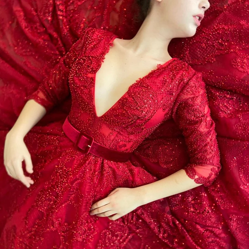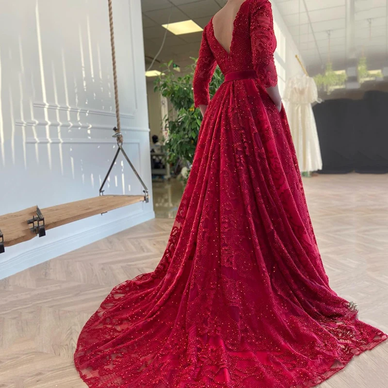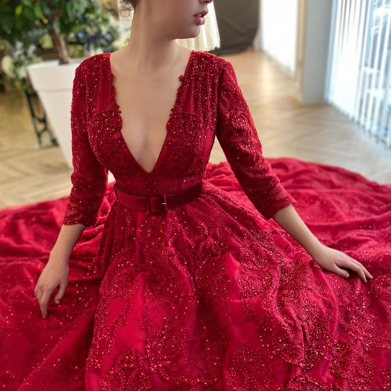UZN элегантное темно-Красное Кружевное ТРАПЕЦИЕВИДНОЕ длинное платье для выпускного вечера с v-образным вырезом Роскошная сверкающая отделка бисером вечернее платье новое поступление размера плюс вечерние платья Платье не включает пояс на картинке, пожалуйста, обратите внимание на заказ befere.