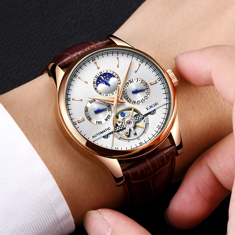 Часы наручные LIGE Мужские механические Автоматические, Брендовые Часы-скелетоны с турбийоном, с календарем, Прямая поставка, с коробкой