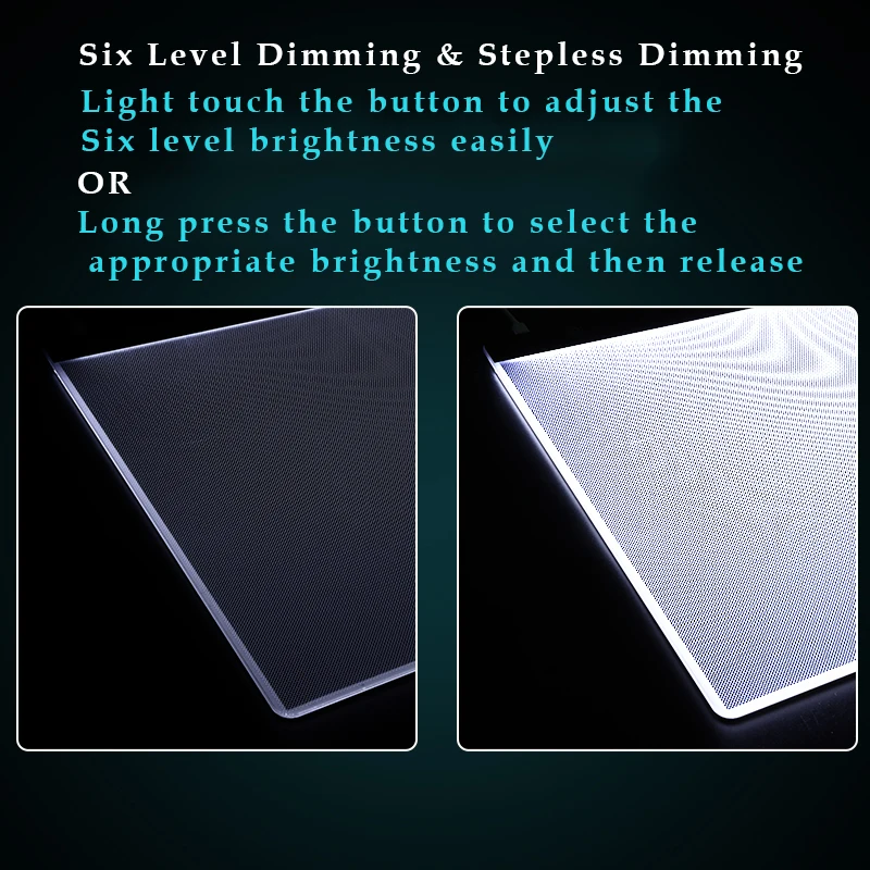 Рабочая поверхность: акриловая панельСветильник источник света: светодиодныйЯркость: шесть уровней затемнения и плавное затемнениеЛюкс: 2000-2500LUXЦветовая температура: 6500K (± 300K)Освещенное пространство: 60*40 см (23,63x15,74 дюйма)Источник питания: Тип CТип C кабель Длина: около 1,5 метров
