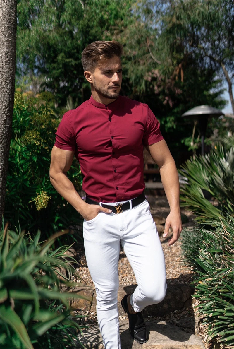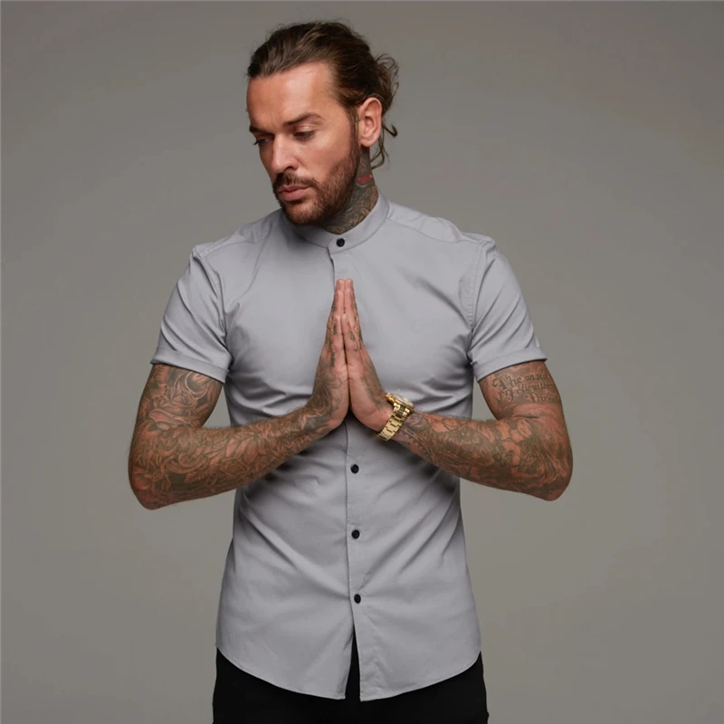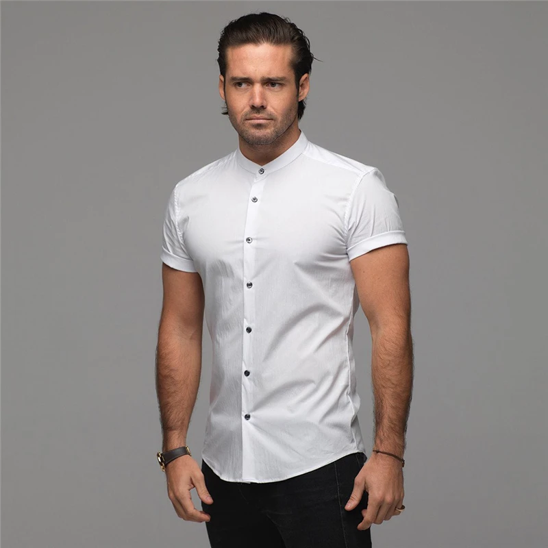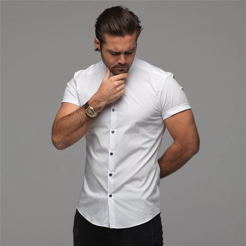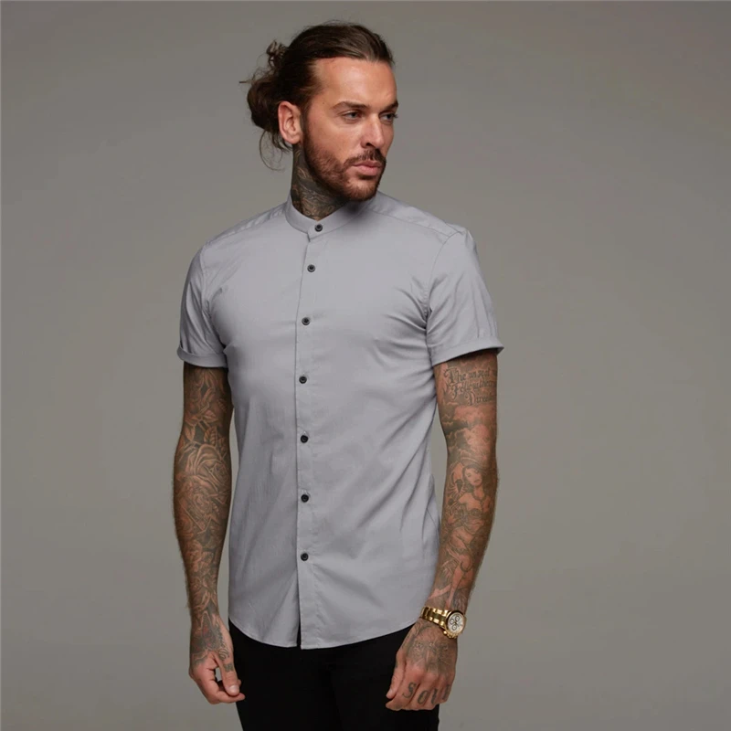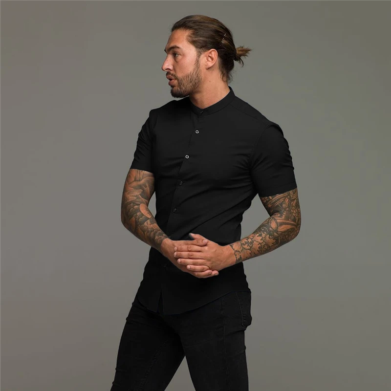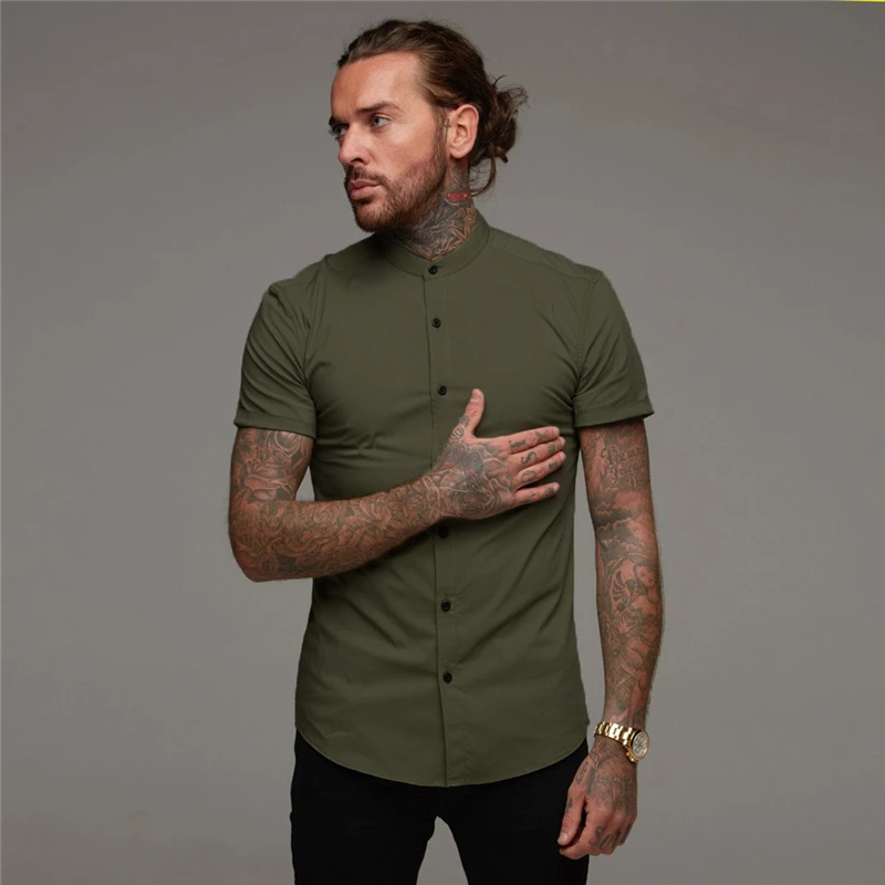 Брендовая Повседневная летняя Роскошная однотонная приталенная рубашка с коротким рукавом для мужчин, уличная одежда, мужские рубашки, модные спортивные футболки для спортзала