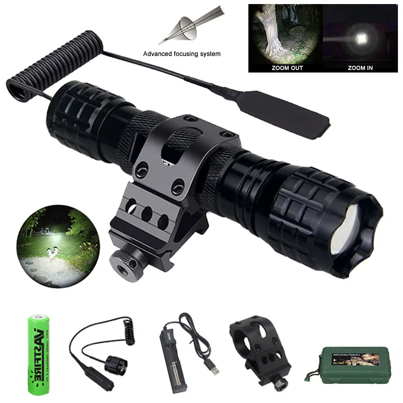 500 Двор Масштабируемые светодиодный тактический вспышки светильник фонарь охотничья лампа перезаряжаемая вспышка светильник + прицела + переключатель + 18650 + Зарядное устройство + коробка
