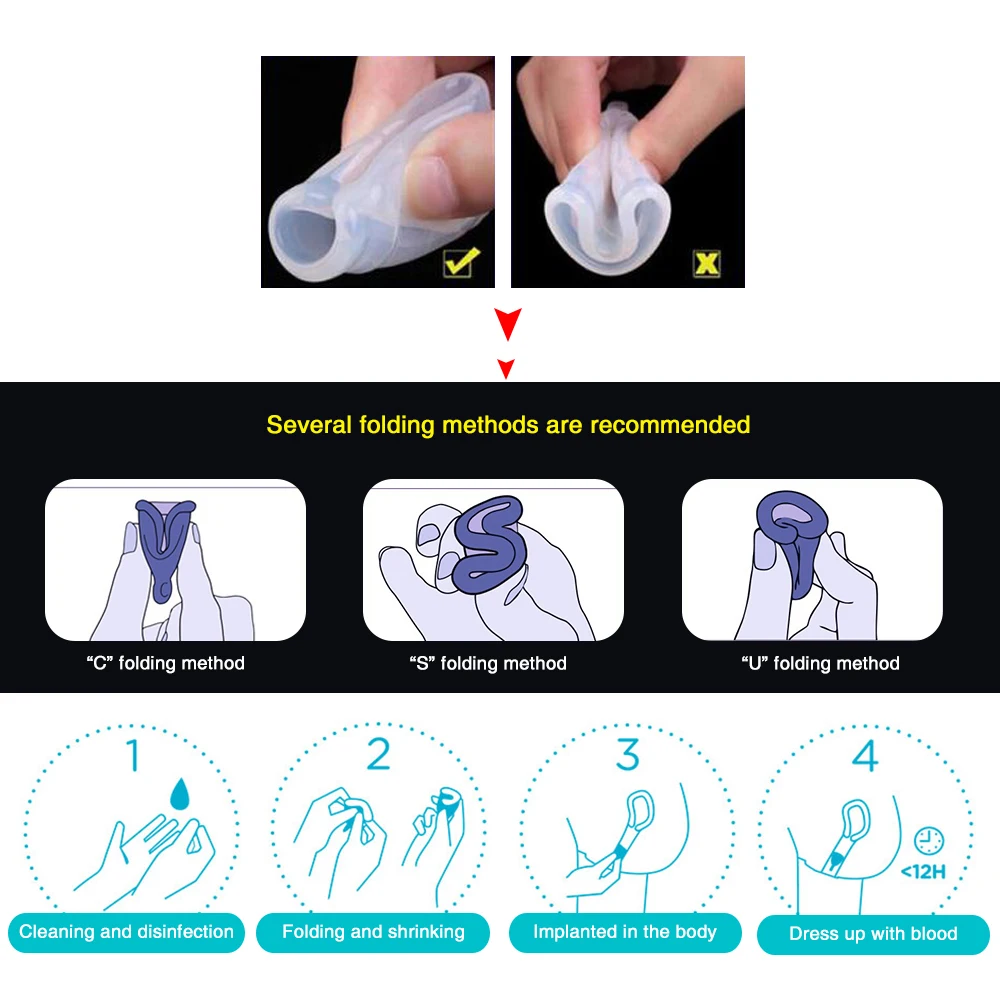 1. Перед обработкой менструальной чашки убедитесь, что ваши руки тщательно чистятся.2. Стерилизовать чашку перед первой вставкой.3. Рекомендуется вставлять чашку в любое из следующих позиций: сидя, приседая, опускаясь на колени или стоя, попробуйте одну из этих позиций и выберите наиболее подходящую для вас.4. Чтобы облегчить вставку, вы можете увлажнить чашку водой или смазочным гелем при необходимости.5. Захватите чашку пальцами и нажмите.6. Затем Сложите чашку пополам, используя пальцы другой руки.7. Удерживайте чашку пальцами одной руки в максимально низком положении.8. Аккуратно вставьте чашку во влагалище в сторону спины.9. Правильное положение чашки ниже, чем тампоны. После введения во влагалище отпустите пальцы и дайте чашке полностью разворачиваться и приклеиться к вагинальной стенке.10. Вы можете дезинфицировать до и после использования.