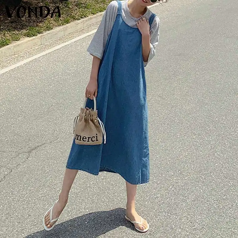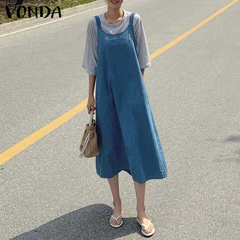 Праздничный джинсовый комбинезон 2021 VONDA, женские длинные платья без рукавов в японском стиле, повседневный Однотонный сарафан, платья