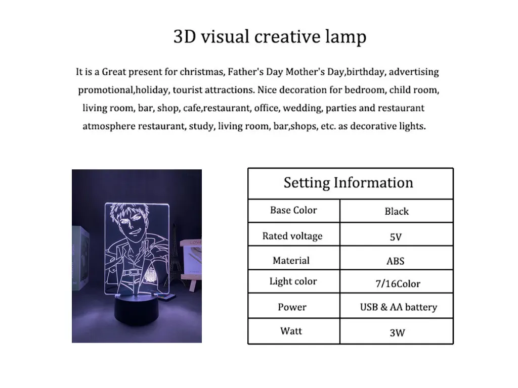 ✔. Если у вас есть индивидуальные требования, пожалуйста, откройте чат и отправьте нам фотографии, которые вы хотите сделать 3D ночной светильник.