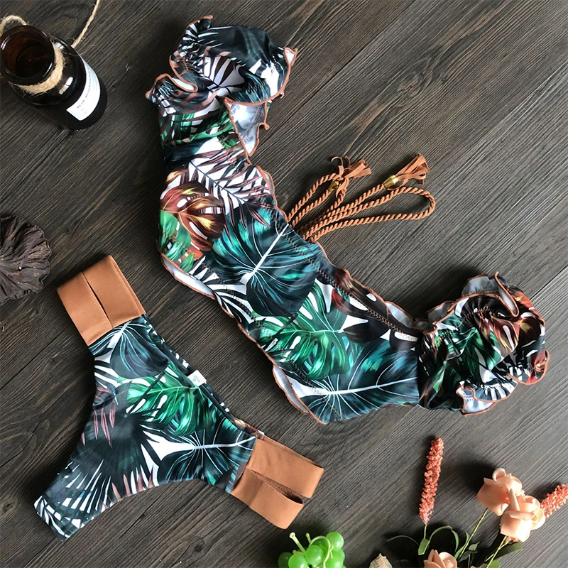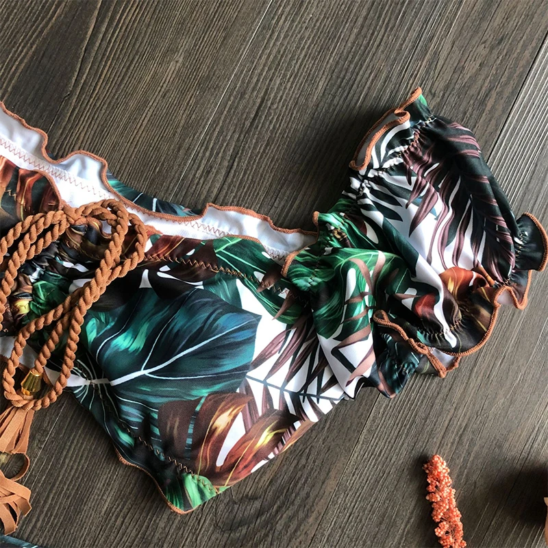 Сексуальный комплект бикини с растительным принтом, лоскутный купальник с кисточками, купальник с высоким вырезом, Женский Ретро бандо, пуш-ап, купальный костюм, бразильское бикини
