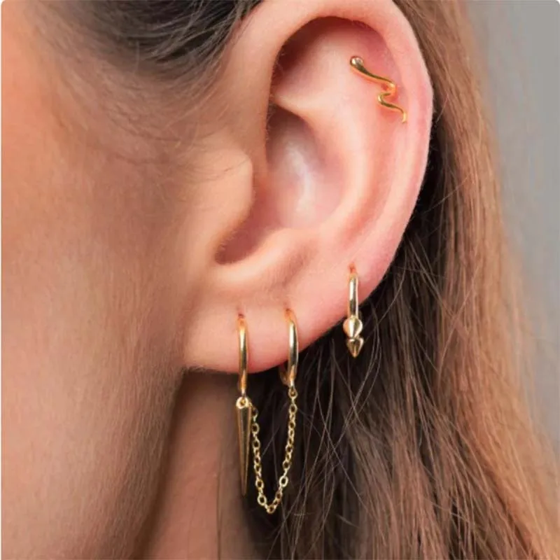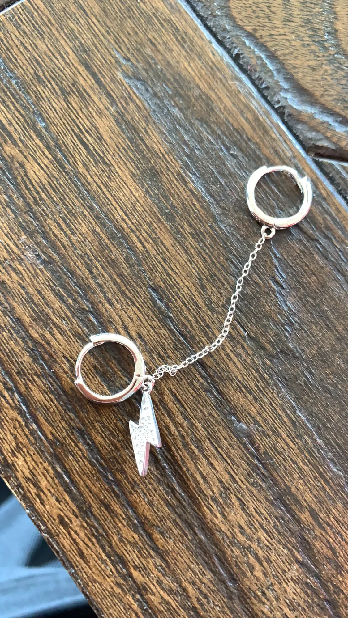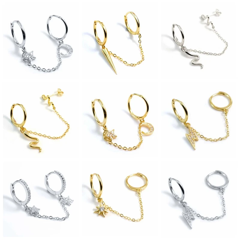 GS 925 пробы серебро двойное отверстие звено цепи круг серьги в виде колец, циркон Луна, Звезды подвеска с молнией Huggie Пирсинг Серьга