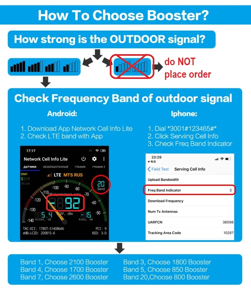 Убедитесь, что сигнал вашего мобильного телефона лучше, чем-95 дБ за пределами вашего дома, который должен отображать 2 ~ 5 баров. Если только показать 0 ~ 1 бар, мы не предлагаем вам купить усилитель.