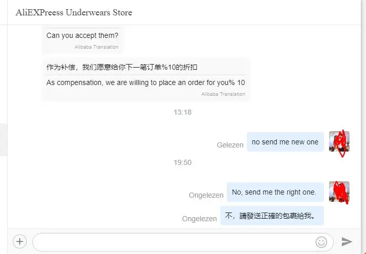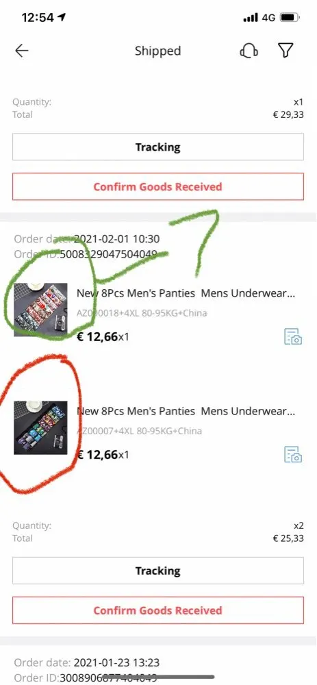 Я очень зол, потому что я заказываю 2 разных пакета с разным нижним бельем, но я получил то же самое. И продавец не отправит мне право. Продавец хочет, чтобы я купил снова со скидкой. Я не хочу покупать снова. Я хочу получить правильное нижнее белье. См. Фотографии ниже.
