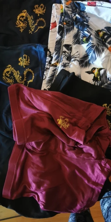 очень быстрая доставка в почтомат. На труселях отсутствует маркировка на английском языке о составе, только на китайском. В описании указано что вискоза, но мне кажется по ощущениям чистая синтетика, выглядит дёшево, на однотонных трусах сверху нанесен принт - дракон ( так себе картинка). С продавцом не общалась