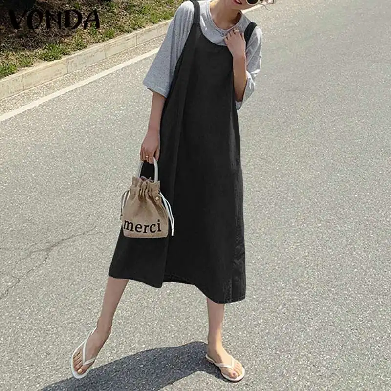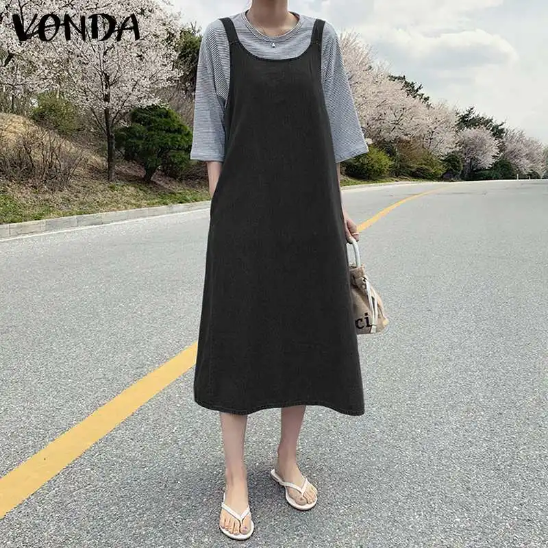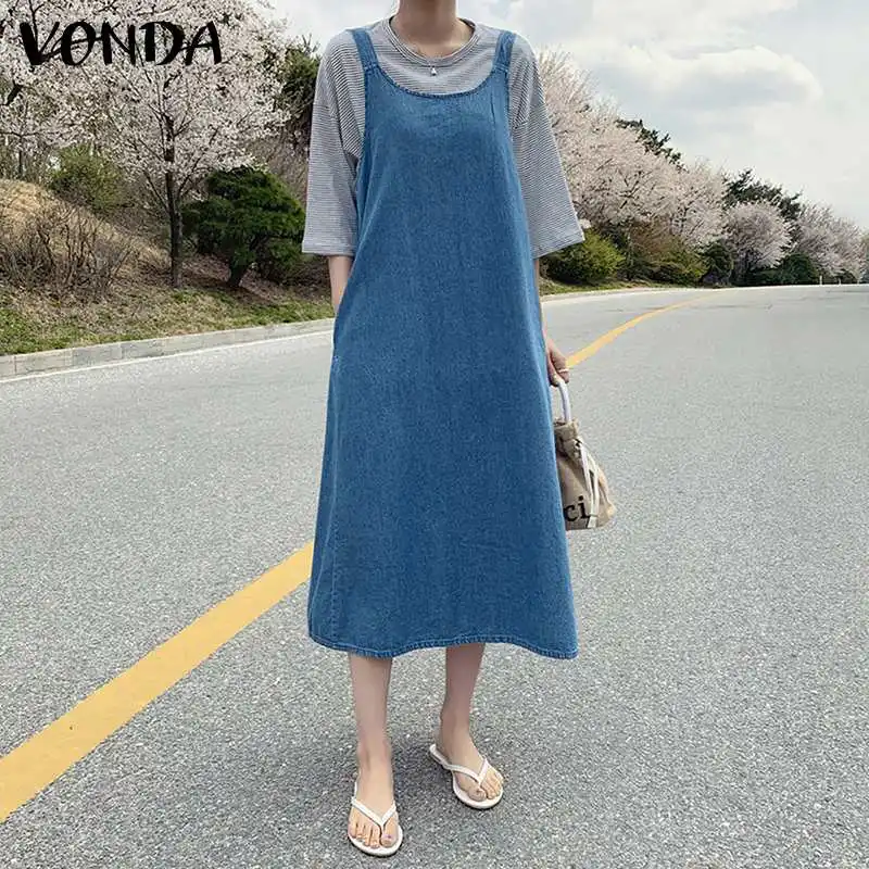 Свободное Плиссированное богемное платье, женское джинсовое платье VONDA 2021, повседневный Однотонный сарафан, сексуальные вечерние платья без рукавов, платья