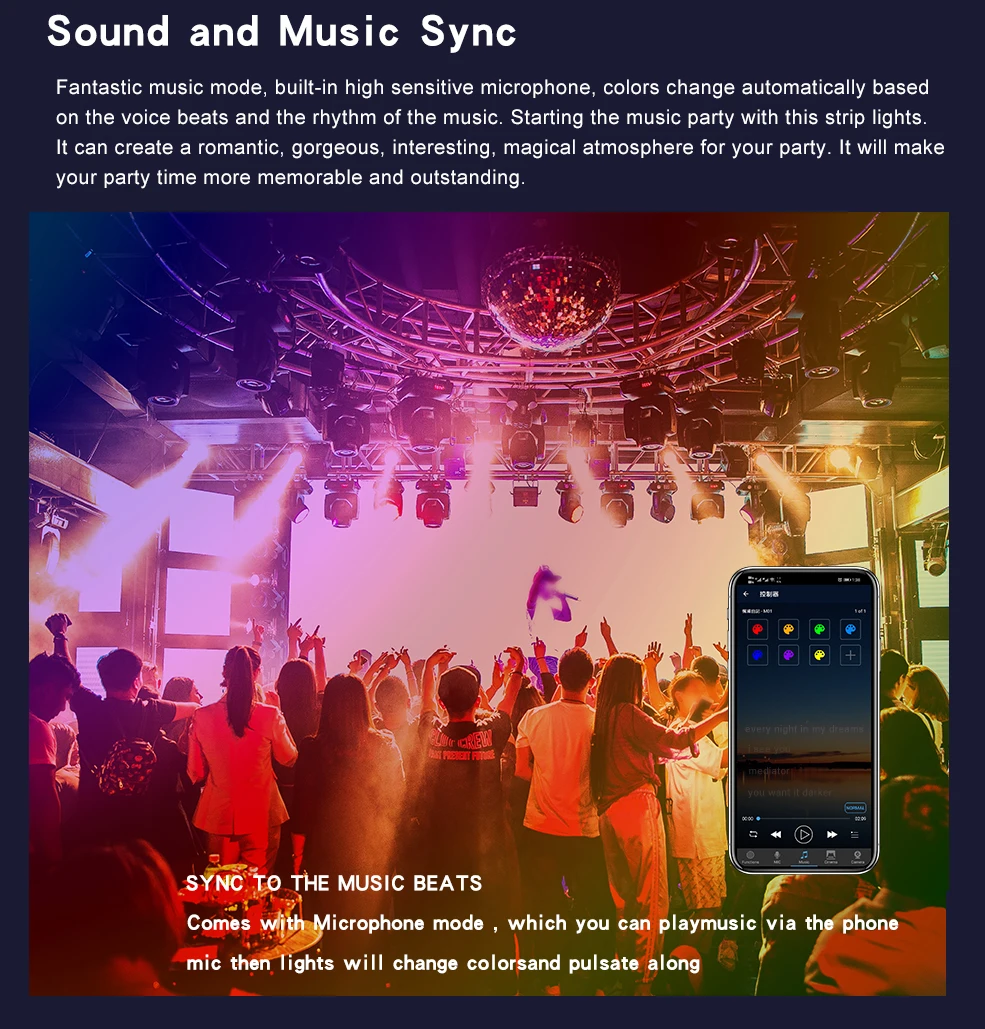 Фантастический музыкальный режим, встроенный высокочувствительный микрофон. Цвет меняется автоматически в зависимости от звука и ритма музыки. Получить музыку вечерние начался с светодиодный светодиодные полосы света. Это может создать романтическую, великолепную, интересную, волшебную атмосферу для ваших вечерние. Это сделает ваши вечерние дни более запоминающимися и выдающимися.