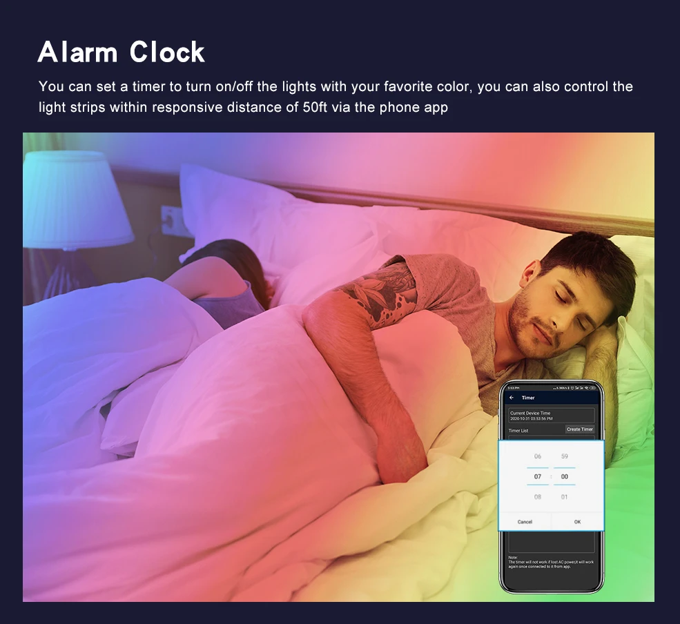 Вы можете установить таймер для включения/выключения света с вашим любимым цветом. Вы также можете контролировать светильник с помощью приложения для телефона на расстоянии 50 футов.
