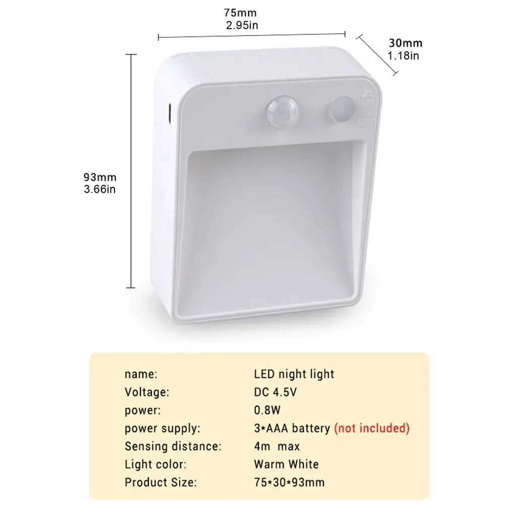 Тип: лестничный ночной Светильник Тип батареи: 3 * AAA батареи (не входят в комплект) Размер: 90*75*30 мм Вес: 70 г Светильник; Цвет: теплый белый Метод управления: индукция человеческого тела + светильник Режим: индукция + постоянный светильник Напряжение AC/DC 4,5 V