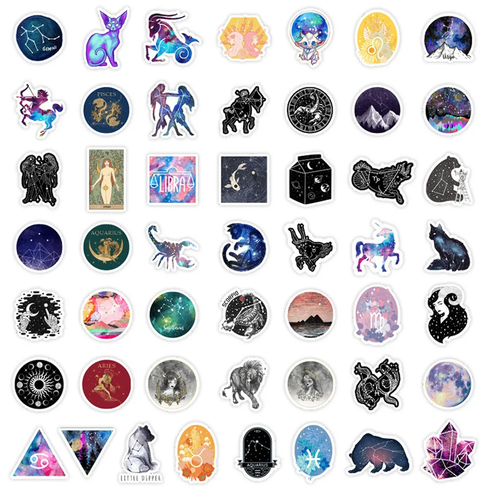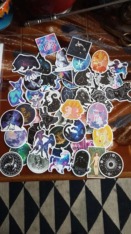 Классные маленькие наклейки! Не было никаких двойных, качество хорошее. Есть хороший диапазон наклеек, покрытых знаками Зодиака, созвездий и общих астрологических изображений. Не все знаки зодиака включены в упаковку, у меня нет наклеек для Льва, например, но много рыбы.