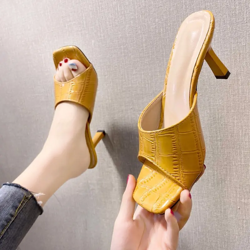 Женские шлепанцы на высоком каблуке, сандалии без застежки с квадратным носком, летние тапочки, 2020