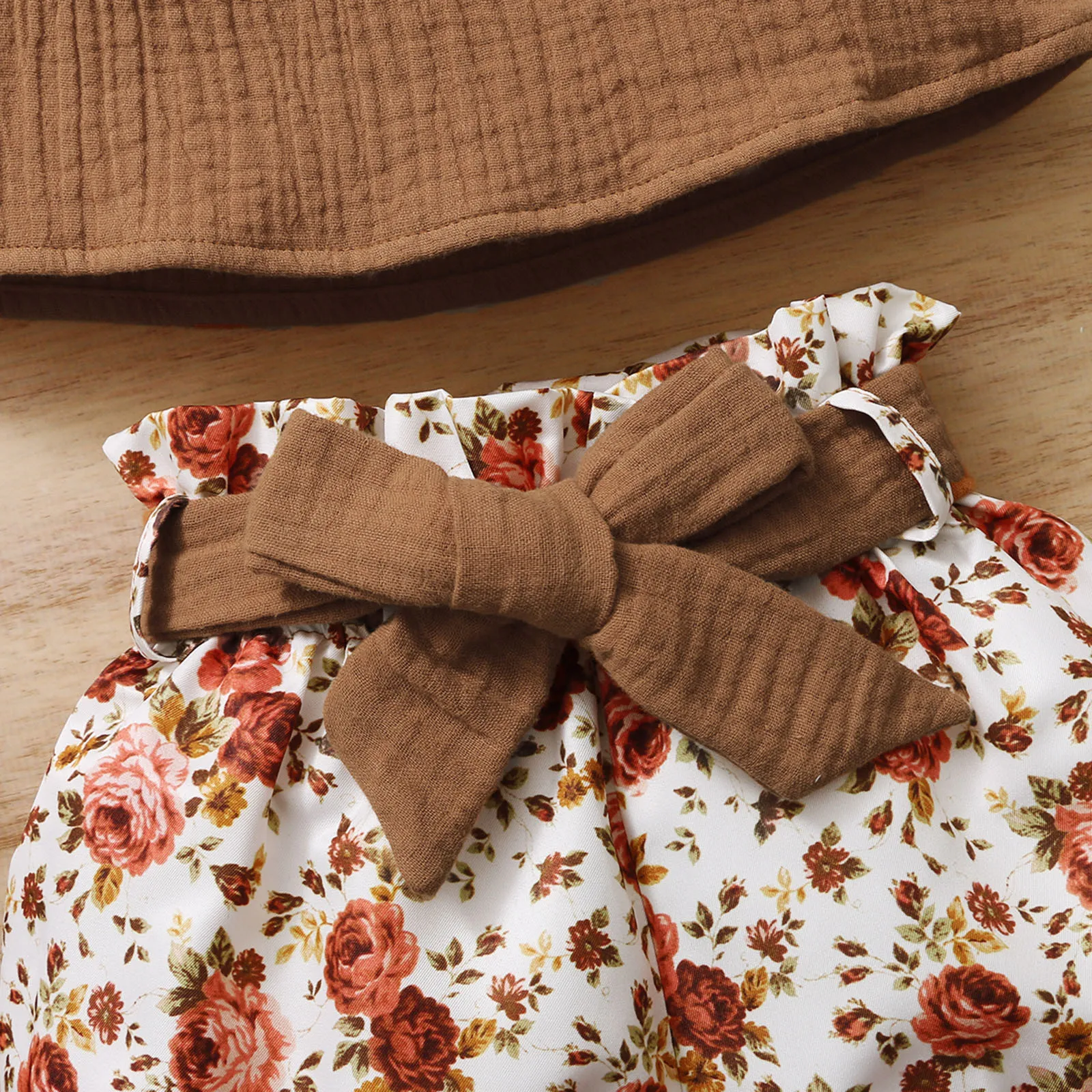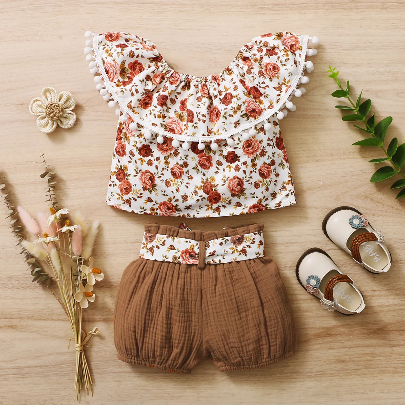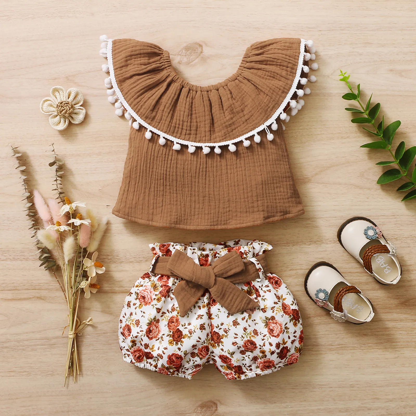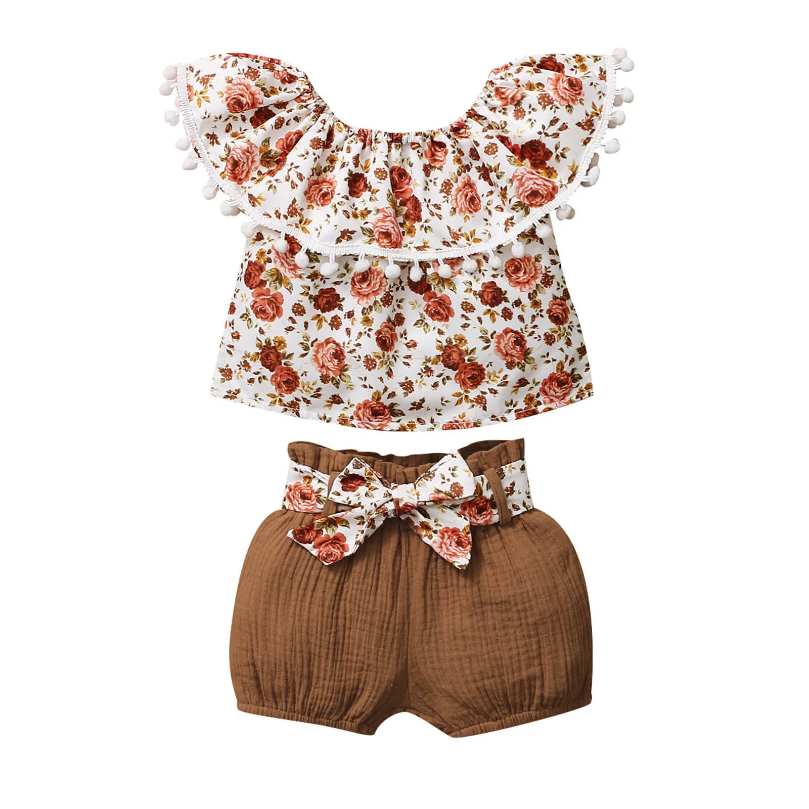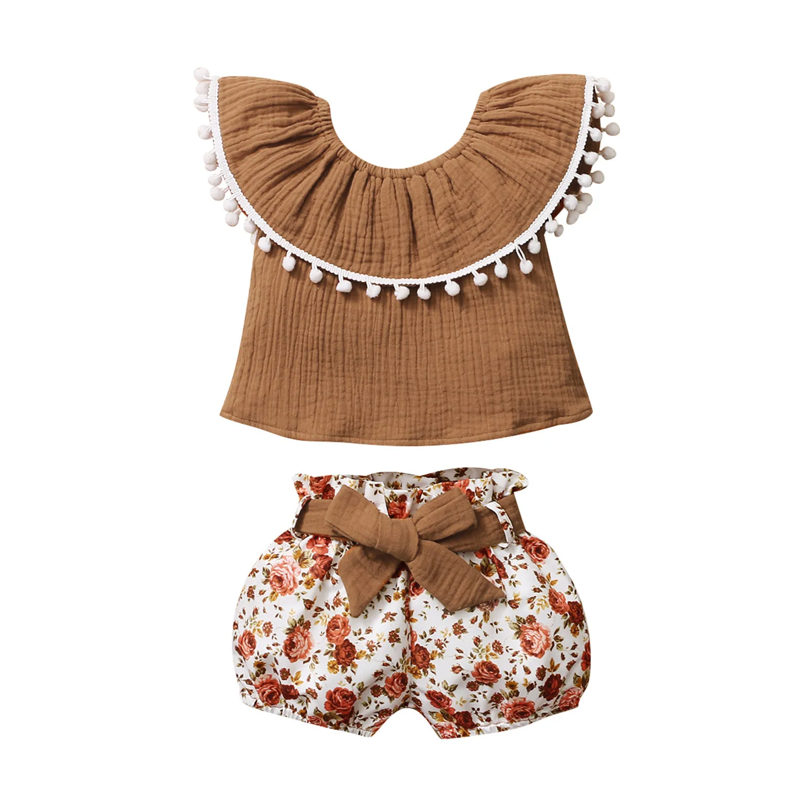 Одежда для маленьких девочек без рукавов с цветами и кистями; Топ + шорты