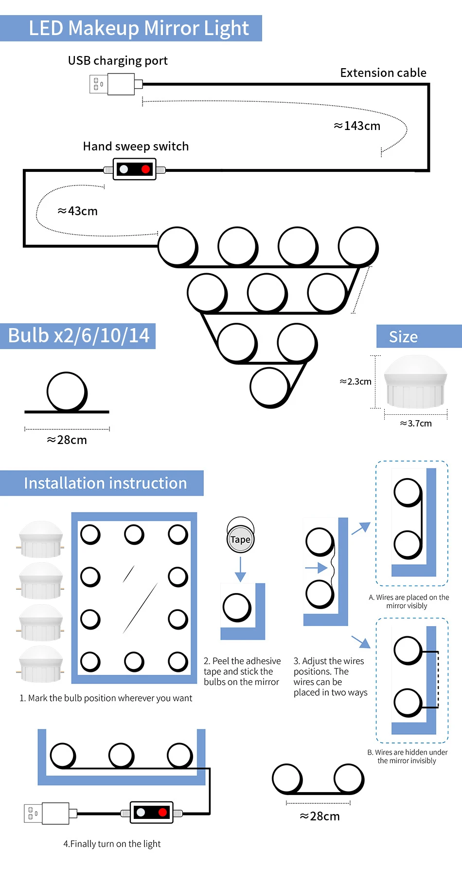 *Предусмотрены двухсторонние ленты и присоски, лампочки могут быть непосредственно и быстро наклеены на зеркала с лентами или присосками.