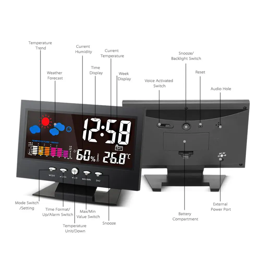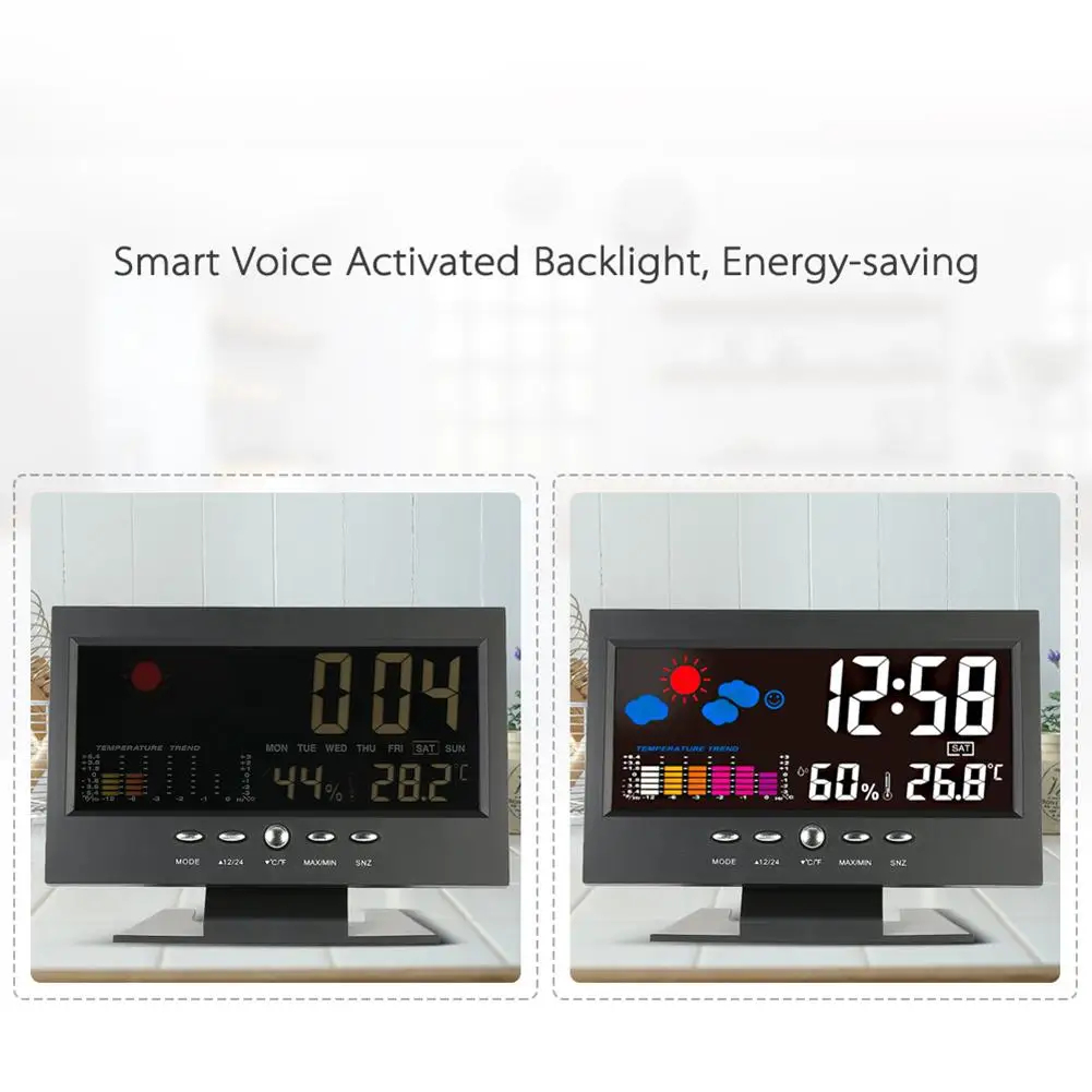 Цифровая метеостанция с ЖК-дисплеем и голосовой активацией, с подсветкой, часы для измерения температуры и влажности, креативный Настольный будильник, большой дисплей, для спальни