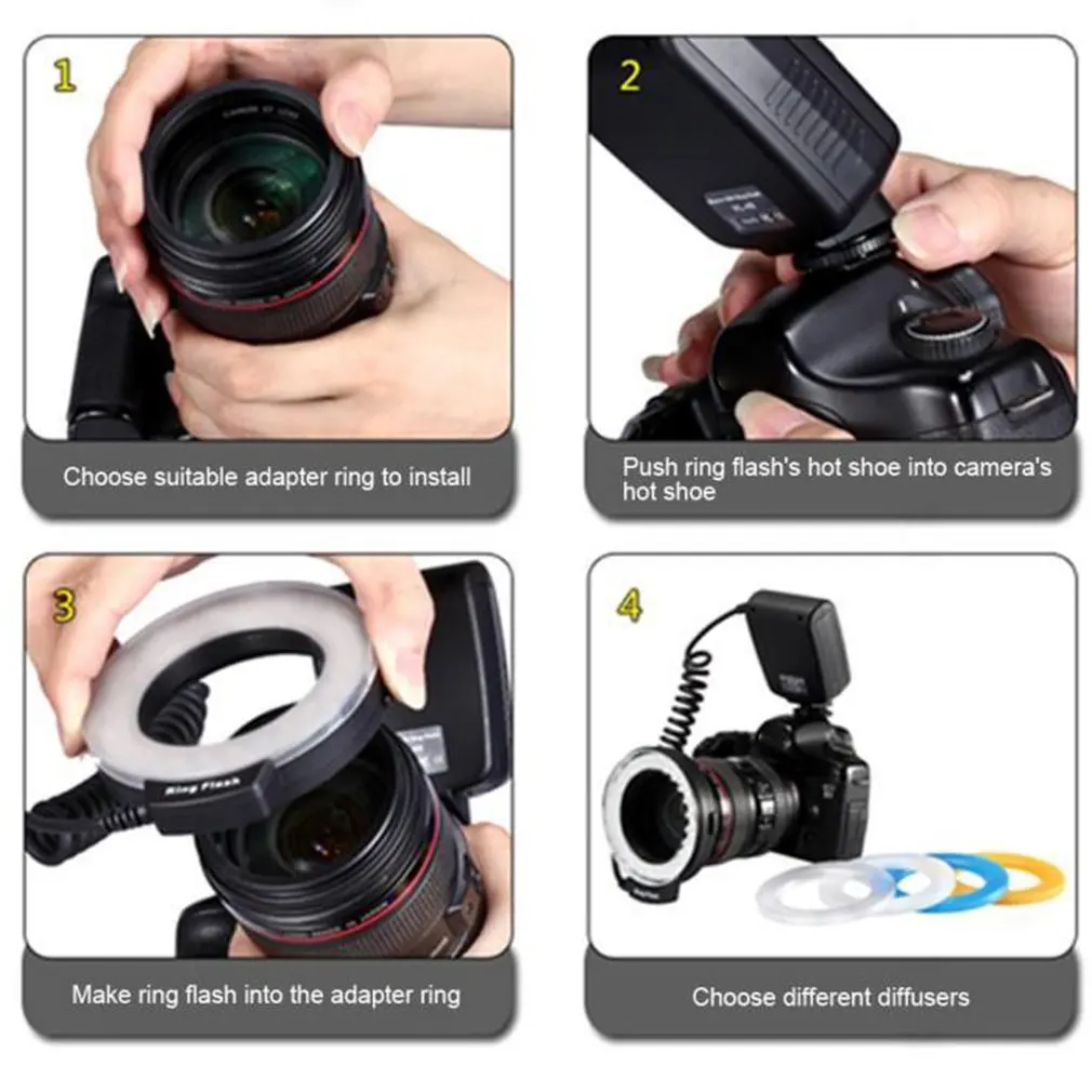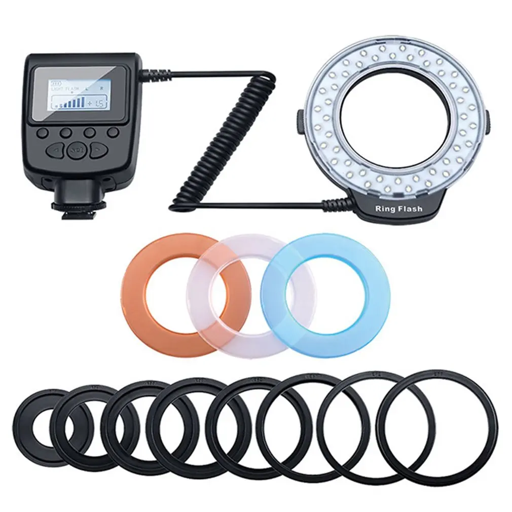 Макросъемка светодиодная Кольцевая вспышка с 8 переходными кольцами для Canon Nikon Pentax Olympus Panasonic DSLR вспышка для камеры
