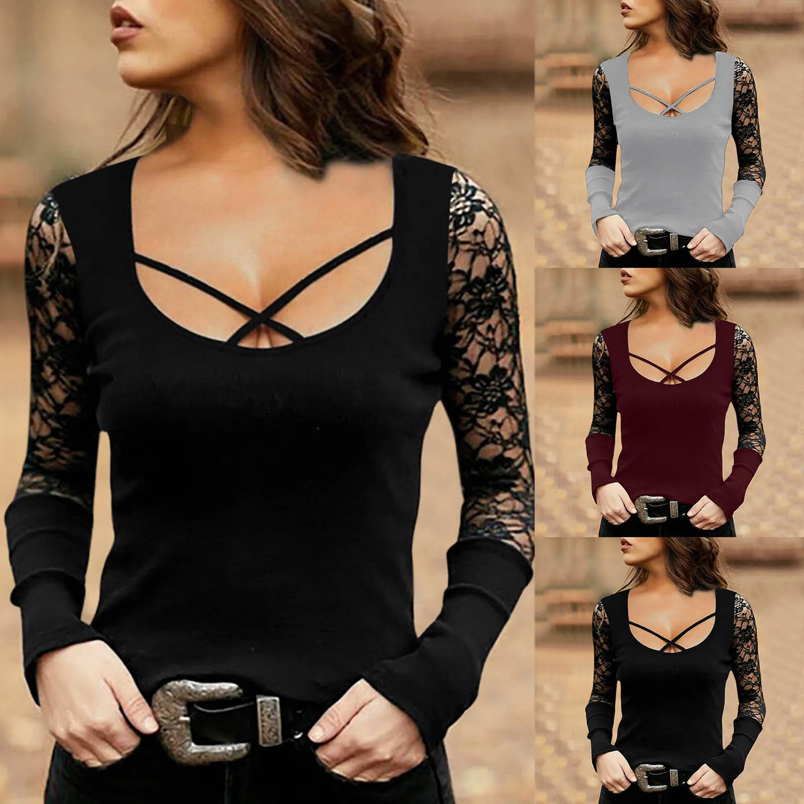 Женская мода, круглый вырез, длинный рукав, крест на груди, повседневные топы, кружевная блузка