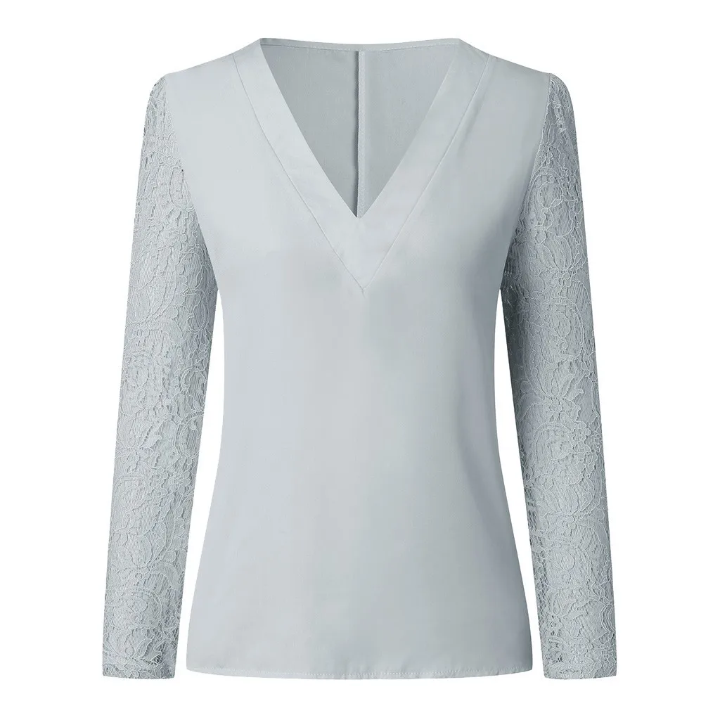 Новая женская модная Кружевная футболка с длинным рукавом, блузка с V-образным вырезом, повседневные женские топы