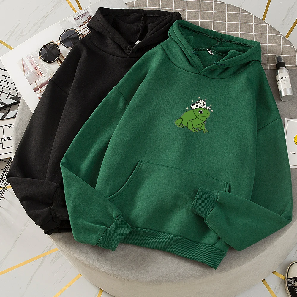 Толстовка женская утепленная свободного покроя, Свитшот в стиле Харадзюку, повседневное худи с милым принтом лягушки, утепленный пуловер с капюшоном, осень