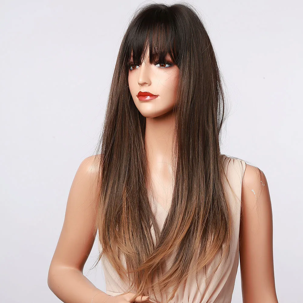 Женские Длинные прямые синтетические парики с челкой, с эффектом омбре